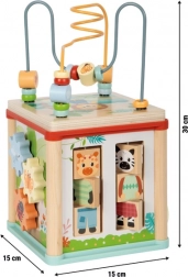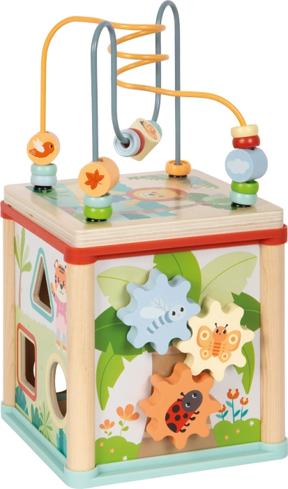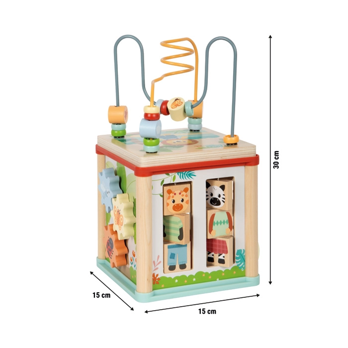 Wielofunkcyjna drewniana kostka motoryczna z certyfikowanego drewna FSC oferuje dzieciom od 12 miesięcy bogate możliwości zabawy i nauki. Zawiera labirynt z koralikami, sorter kształtów, zębate kółka, tory przesuwne oraz obrotowe klocki ze zwierzątkami. Kompaktowe wykonanie z zdejmowaną pokrywą chowaną do środka oszczędza miejsce, rozwija małą motorykę, koordynację ręka–oko, percepcję kształtów i kolorów oraz wspiera kreatywność dziecka.