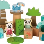 Ta urokliwa układanka przenosi do dziecięcego pokoju świat dżungli pełen zwierzątek i pomysłowych scen. Znajdziesz w niej klocki o różnych kształtach i rozmiarach, nadrukowane elementy z liśćmi i roślinami oraz sympatyczne figurki, takie jak tygrys, panda, małpka czy ptaszki. Dzieci mogą budować wieże, mosty i całe krajobrazy, jednocześnie rozwijając wyobraźnię i snując własne opowieści.