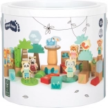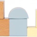 Zestaw zawiera sześciany, walce, łuki oraz nadrukowane elementy w naturalnych i pastelowych kolorach, które wspierają wyobraźnię i myślenie przestrzenne.