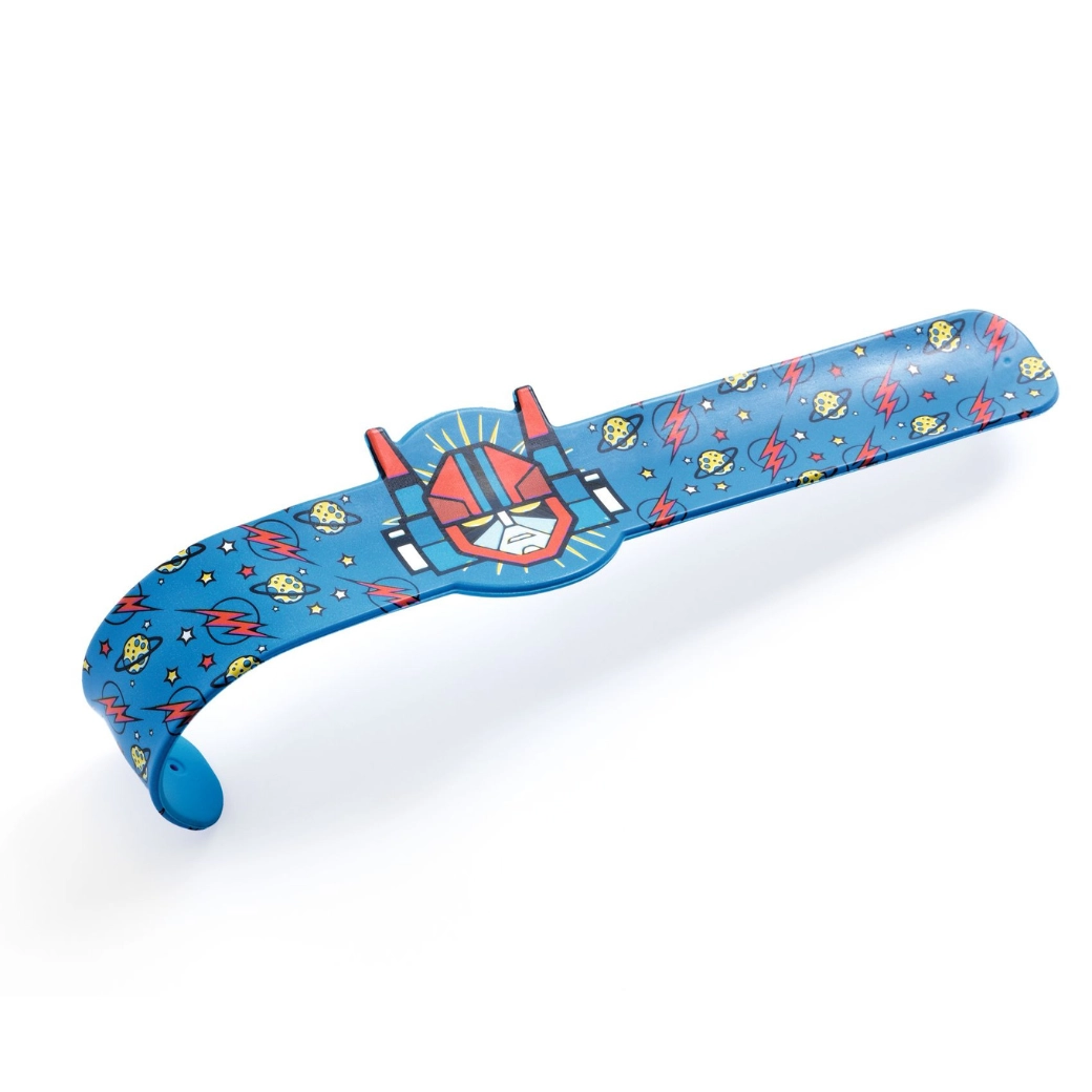 Odkryj zabawne bransoletki slap DJECO z motywami superbohaterów, dinozaurów, tygrysów i robotów. Dzięki elastycznej metalowej taśmie pokrytej wytrzymałym plastikiem bransoletka po lekkim „kliknięciu” sama owija się wokół ręki. Dzieci pokochają je za bezpieczne i szybkie zakładanie oraz wyrazisty design.