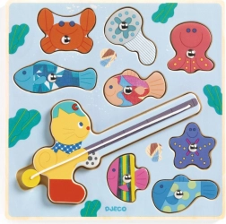 Zabawna drewniana układanka o tematyce wędkarskiej dla najmłodszych. Dzieci za pomocą magnetycznej wędki „łowią” rybki i umieszczają je w odpowiednich kształtach. Wspiera małą motorykę, koordynację ręka–oko oraz cierpliwość. Wesoły motyw z kotkiem i kolorowymi rybkami zachwyci każdego małego wędkarza.