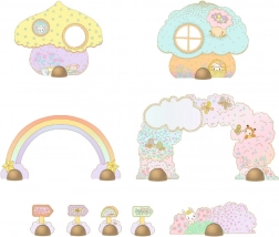 Zestaw zawiera wolnostojące wycinanki domków, tęczy i znaków, które rozbudowują gotową scenę i pobudzają wyobraźnię podczas swobodnej zabawy.
