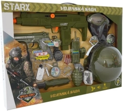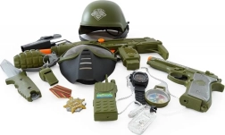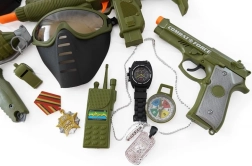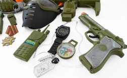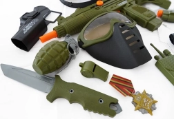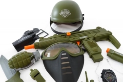 Zestaw dla małego żołnierza z hełmem, pistoletem i innymi akcesoriami.