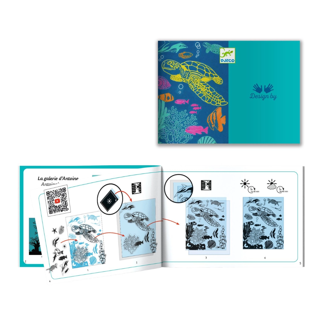 Odkryj magię niebieskiej fotografii z kreatywnym zestawem Djeco Podwodny świat! Dzięki technice cyjanotypii dzieci stworzą własne, oryginalne obrazki z motywami morskich stworzeń. Zestaw wspiera kreatywność, małą motorykę i radość tworzenia.