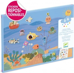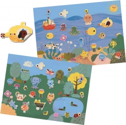 Ten kreatywny zestaw oferuje dwa ilustrowane tła – podwodny świat i las ze stawem – oraz arkusz uroczych naklejek z rybkami, krabem, łodzią podwodną, łódką, leśnymi zwierzątkami i innymi motywami. Dzieci mogą dowolnie przenosić naklejki i wymyślać wciąż nowe historie.