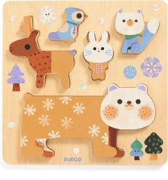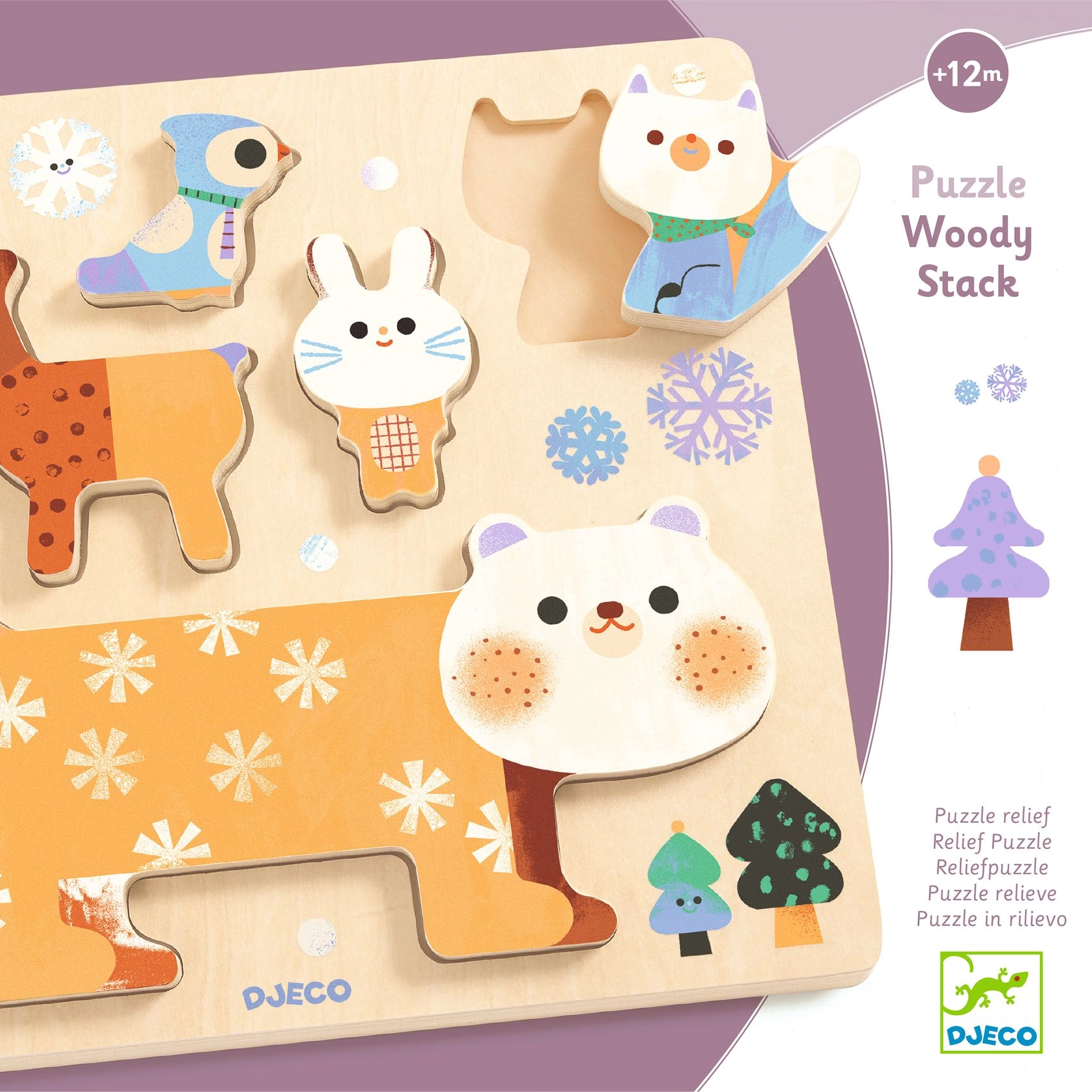 Ten zestaw łączy klasyczne wkładane drewniane puzzle z wieżą balansową. Zabawne zwierzątka – miś, królik, ptaszek, sarna i sowa – można wkładać w planszę według kształtu albo budować z nich wieżę i ćwiczyć równowagę. Gra pomaga dzieciom rozwijać cierpliwość i percepcję przestrzenną.