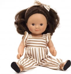 Ubranko w pasiasty wzór, dopasowana opaska i wygodne sandałki nadają lalce charakterystyczny styl. Realistyczne rysy i brązowe włosy wspierają empatyczną i opiekuńczą zabawę, która rozwija umiejętności społeczne.