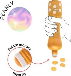 Piankowe flamastry DJECO z perłowym połyskiem zostały zaprojektowane dla małych artystów. Dzięki szerokiej piankowej końcówce kolor nakłada się równomiernie, nie spływa i łatwo się zmywa ze skóry oraz większości tkanin. Delikatny perłowy efekt doda każdemu obrazkowi magicznego blasku.