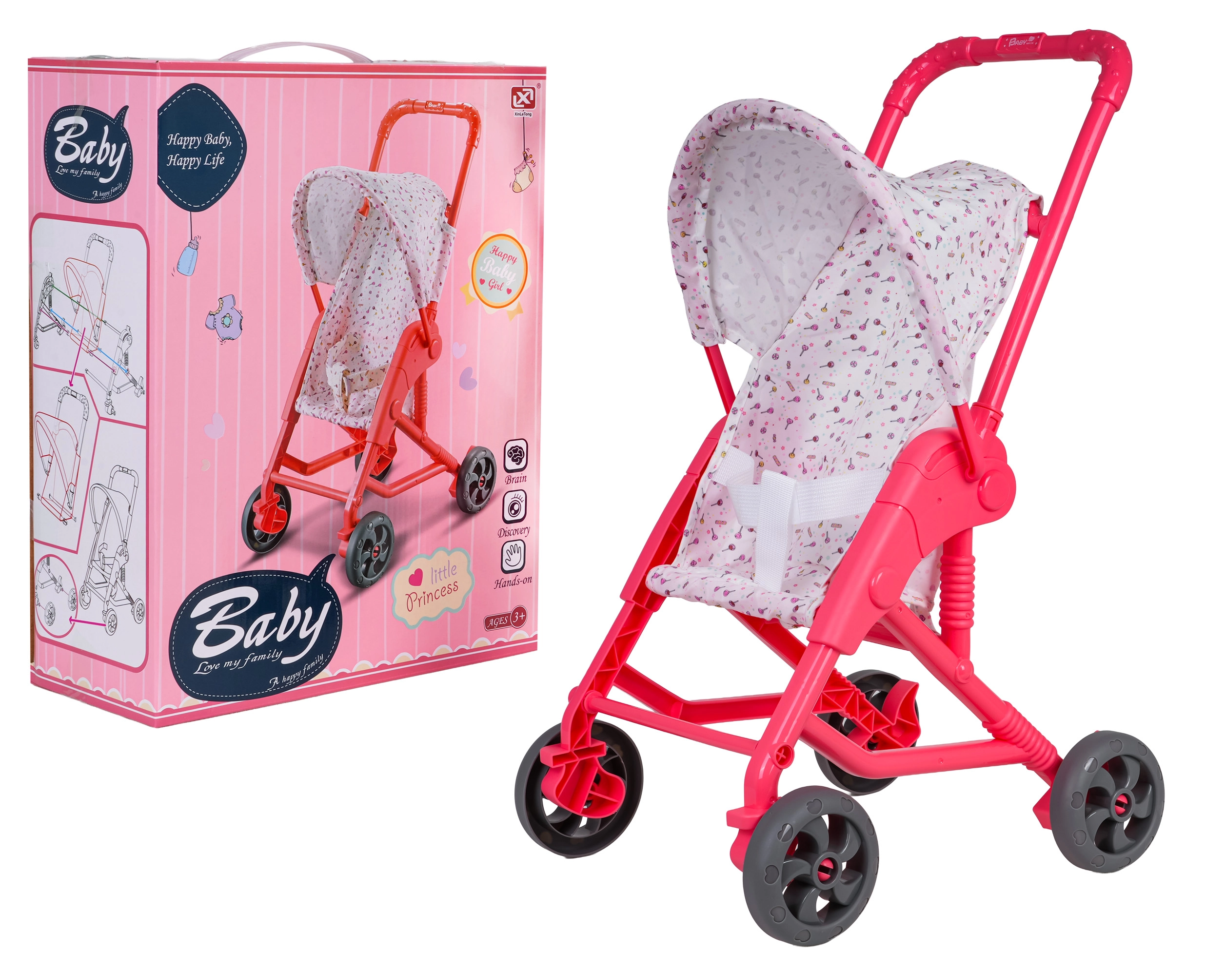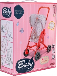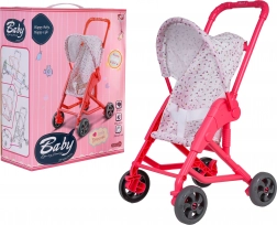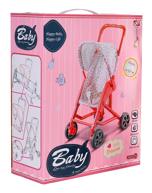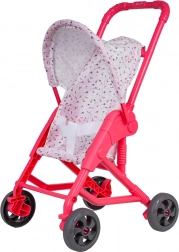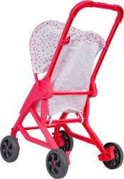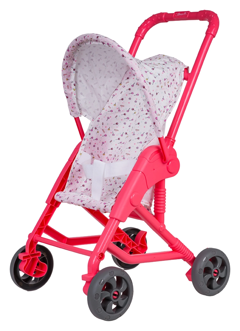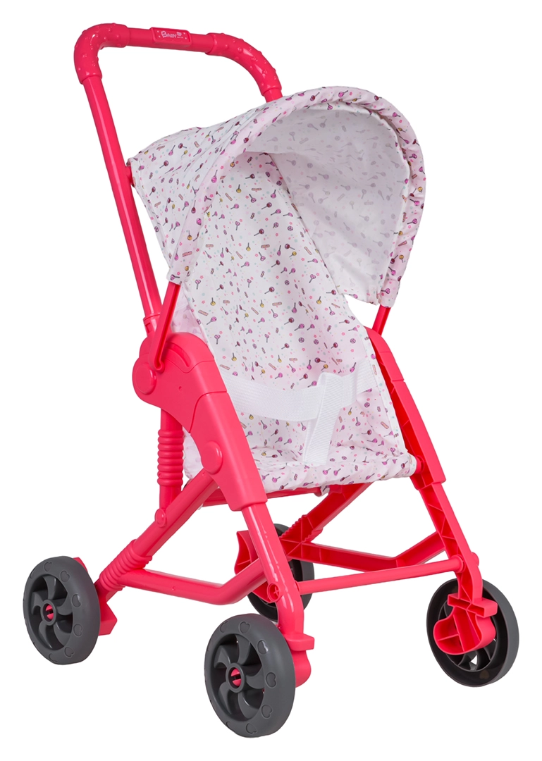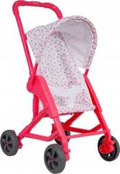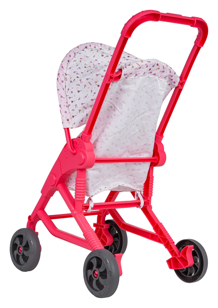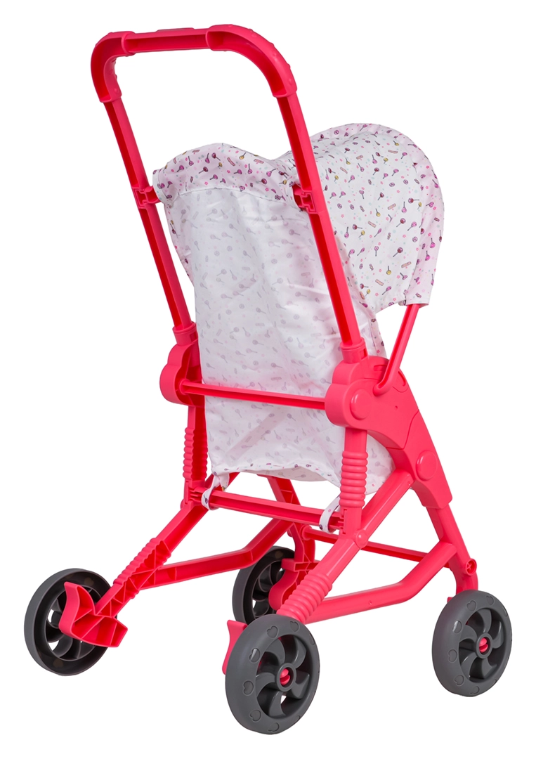 Tekstylny siedzisko i daszek bezpiecznie trzymają lalkę na miejscu, a wózek łatwo się przechowuje dzięki kompaktowej ramie.