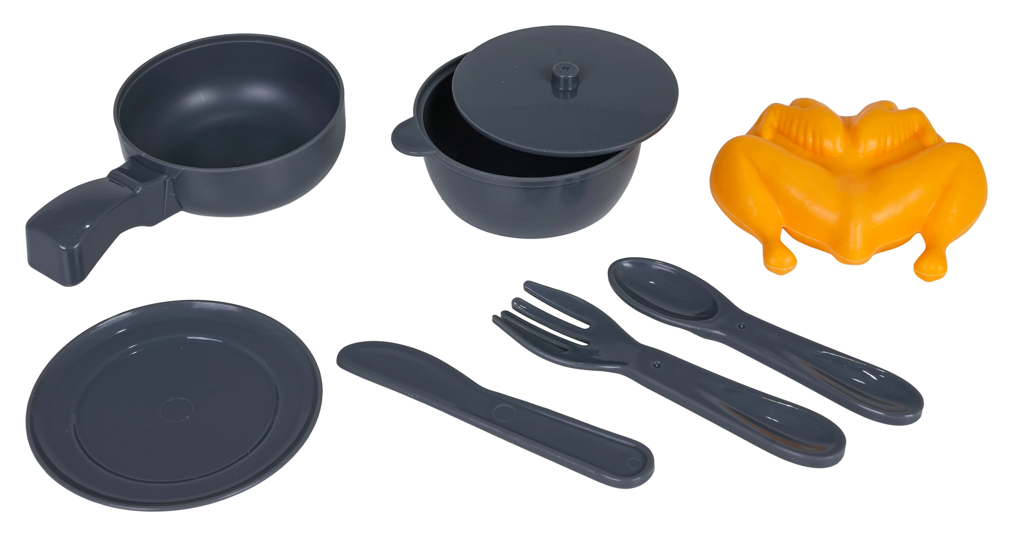 • Akcesoria w zestawie: garnek z pokrywką, patelnia, kurczak, talerzyk, nóż, widelec, łyżeczka