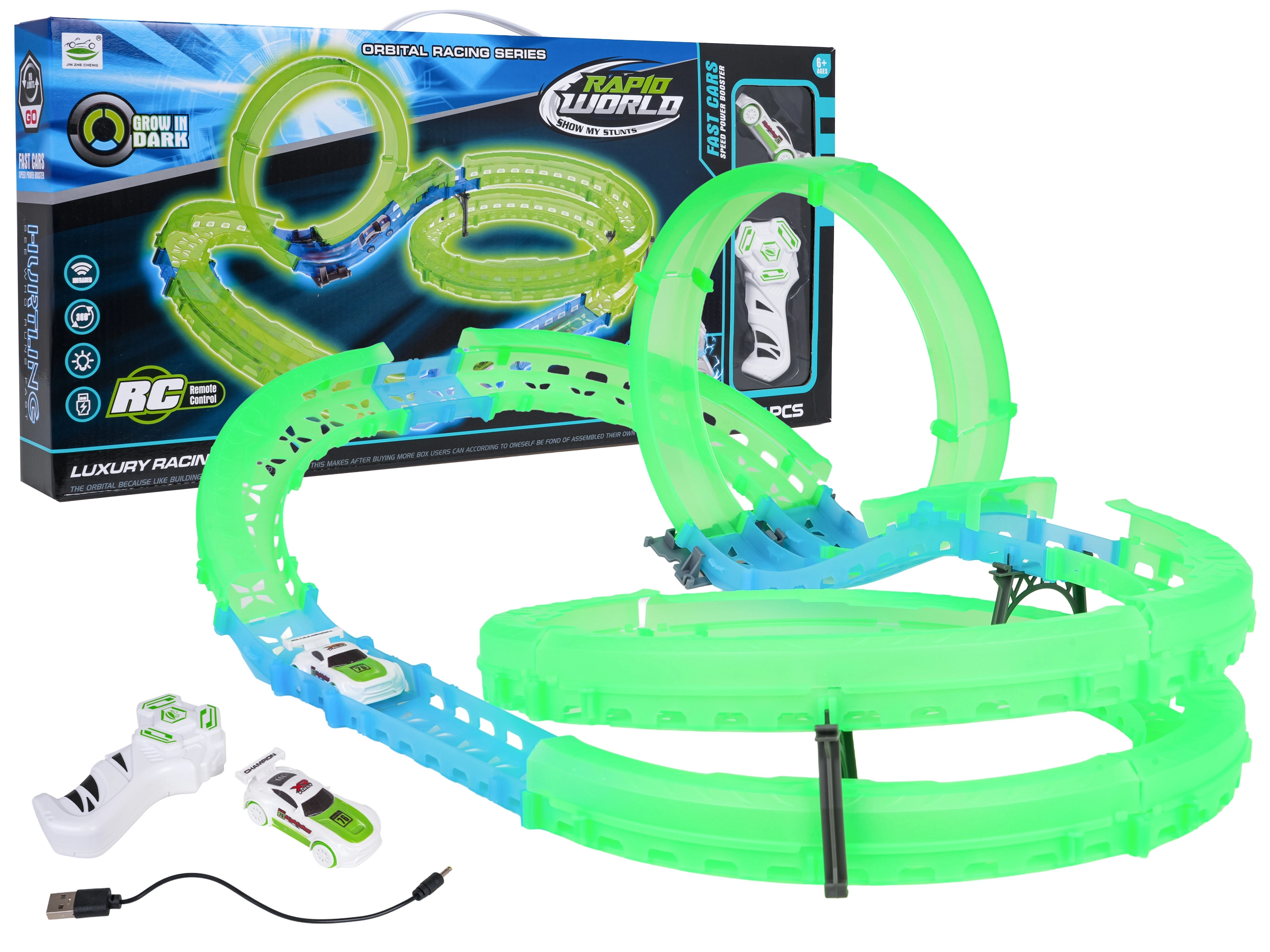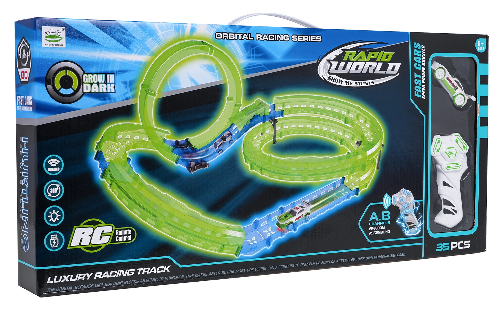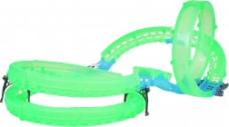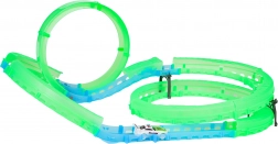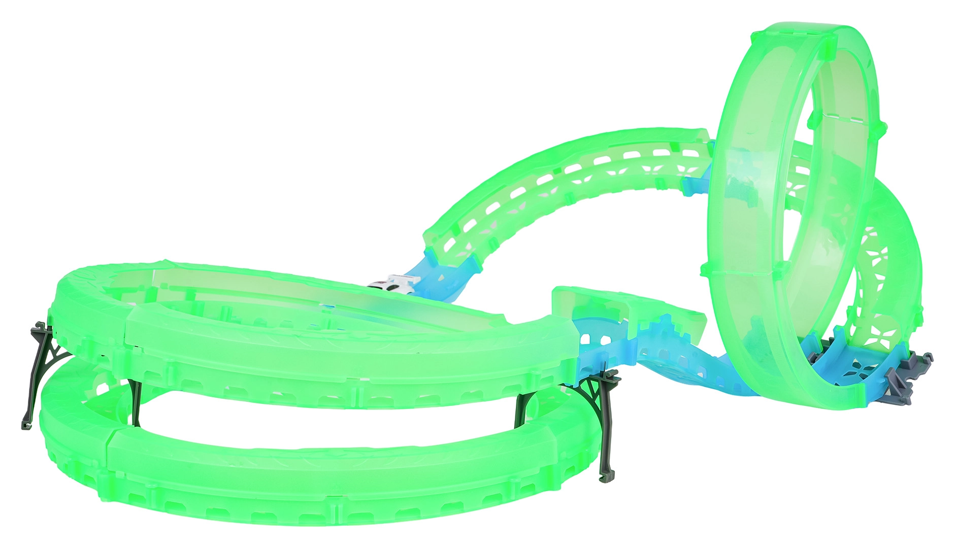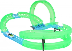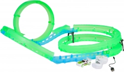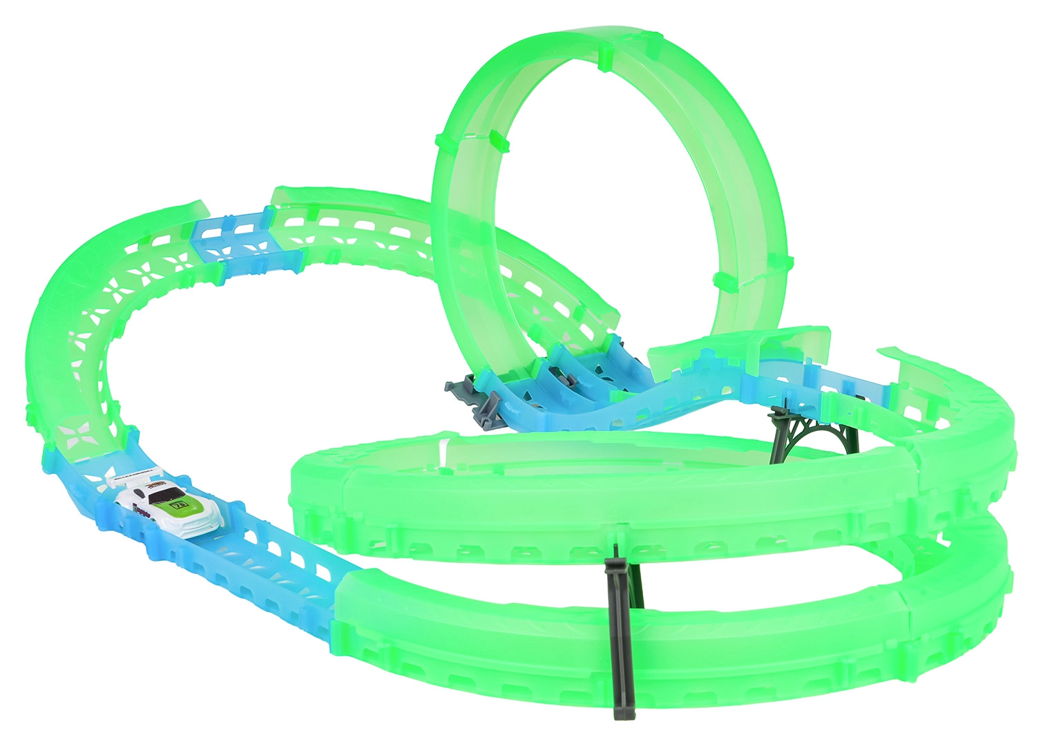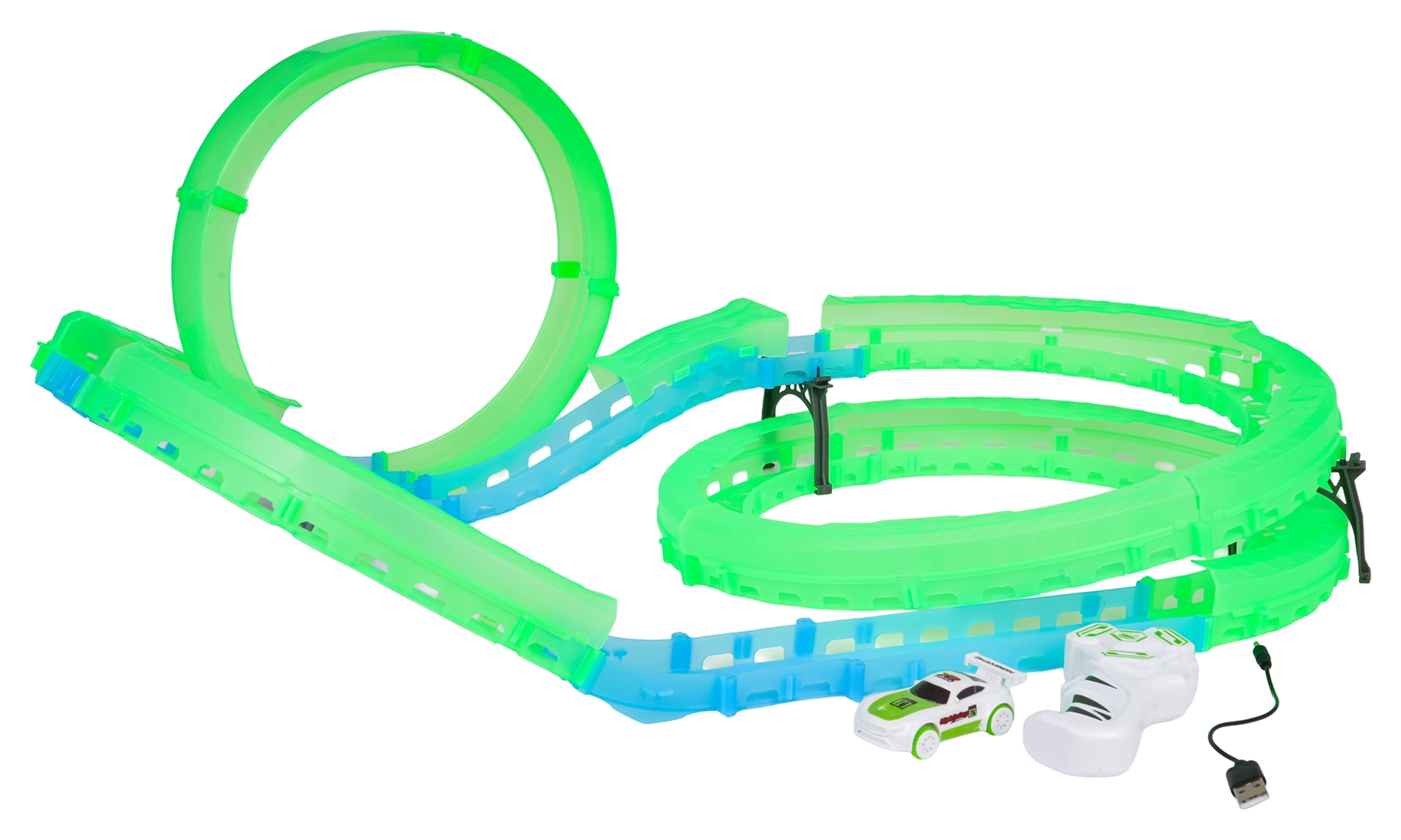 Ten duży świecący tor wyścigowy zamieni dziecięcy pokój w dynamiczną arenę. Fluorescencyjne elementy po naświetleniu pięknie świecą, a autko z efektami LED tworzy podczas jazdy świetlne ślady. Dzięki prostemu łączeniu części dzieci łatwo zbudują własny tor i od razu ruszą do wyścigu.