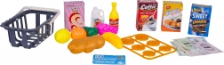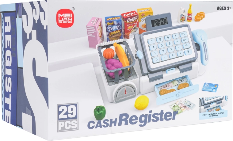 Zestaw zawiera aż 29 elementów, w tym banknoty i monety euro, kartę płatniczą oraz różne atrapy produktów spożywczych (owoce, pieczywo, napoje i małe pudełeczka). Zabawny i bezpieczny zestaw na długie godziny odgrywania ról.