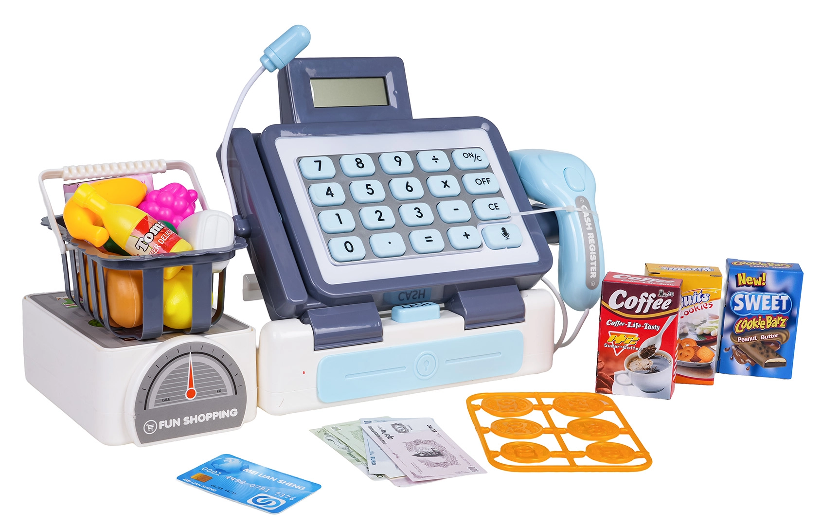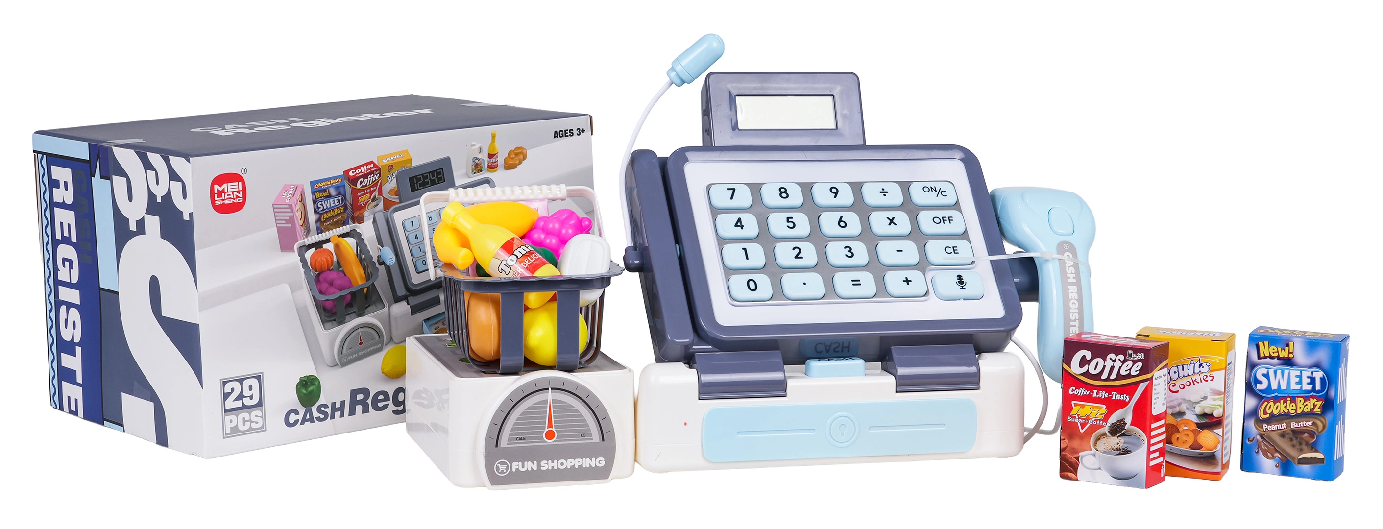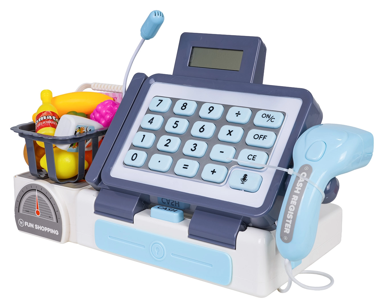 - Kalkulator z dźwiękami, ręczny skaner ze światłem i dźwiękiem, mikrofon, waga (atrapa), otwierana szuflada na pieniądze