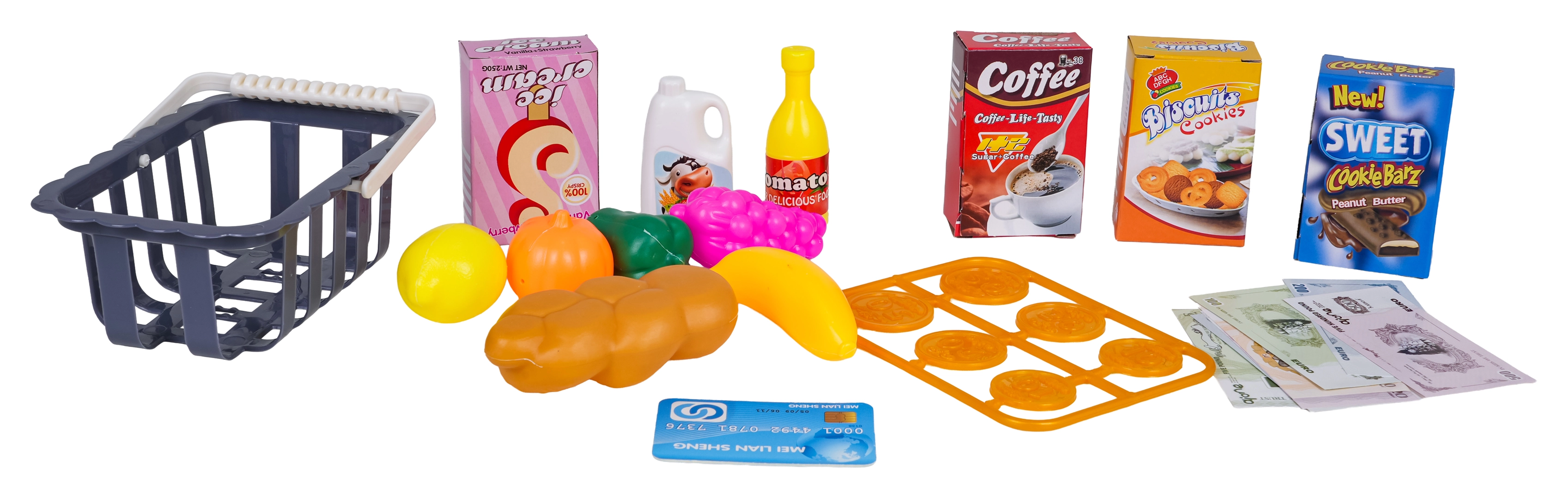 - Kasa, koszyk na zakupy, banknoty euro (5, 10, 20, 50, 100, 200, 500), monety euro (2×10, 2×20, 2×50), karta płatnicza, atrapy produktów (banan, winogrona, zielona papryka, cytryna, dynia, bułka/chałka, mleko, sos pomidorowy, 4 pudełka: ciasteczka, lody, batonik, kawa)
