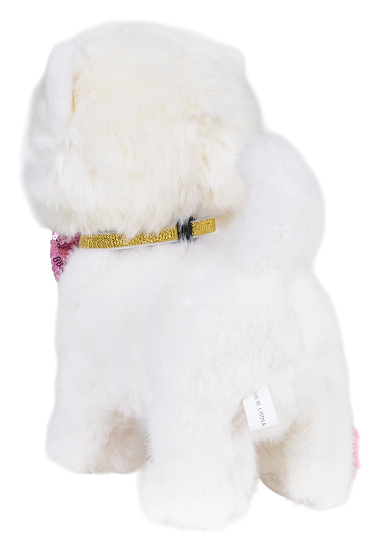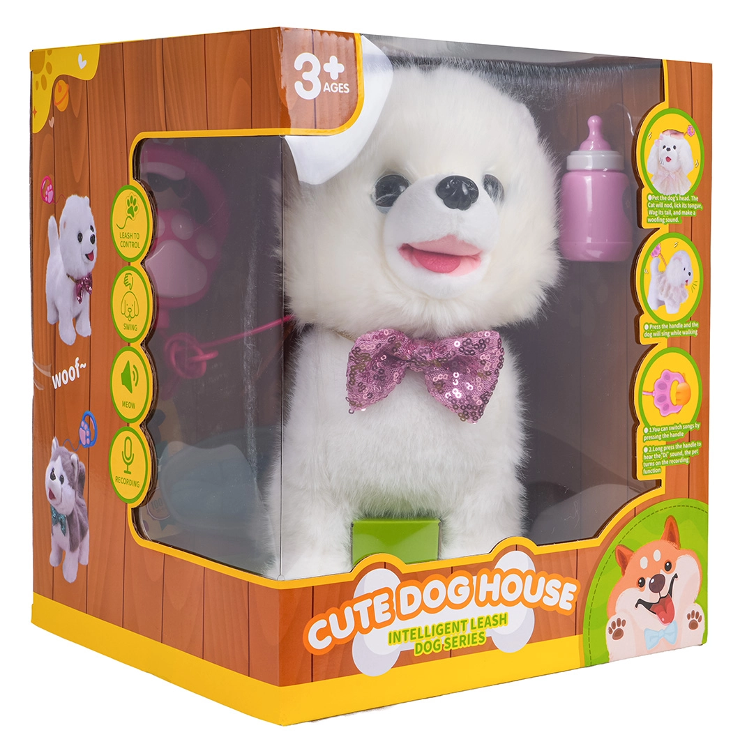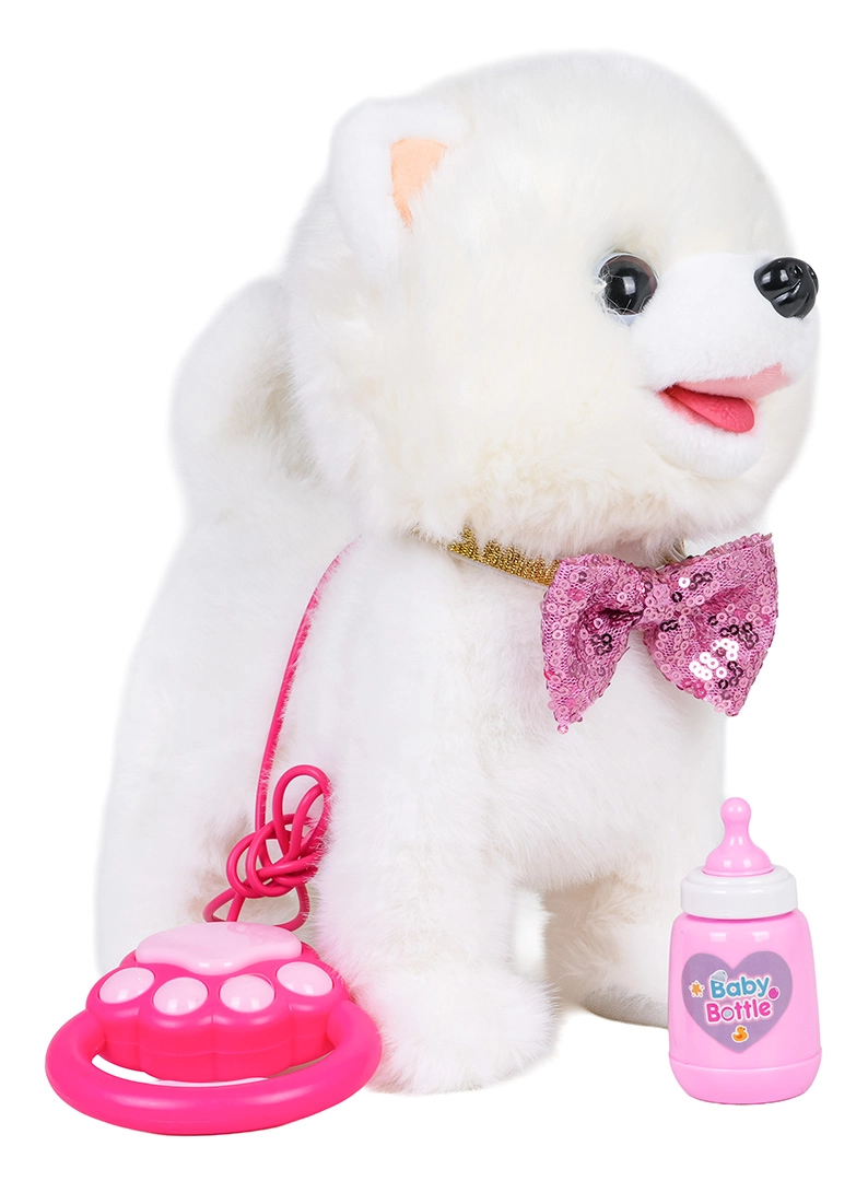 Uroczy biały interaktywny piesek dla dzieci od 3 lat zapewnia mnóstwo zabawy i przytulania. Wykonany z miękkich i bezpiecznych materiałów, potrafi chodzić, szczekać, merdać ogonkiem, kiwać główką, a nawet oblizywać się języczkiem. Dzięki pilotowi/smyczy reaguje na naciśnięcie, chodzi w rytm muzyki i ma funkcję nagrywania i odtwarzania, więc uroczo powtórzy Twoje słowa. W zestawie znajduje się także buteleczka do karmienia dla jeszcze bardziej realistycznej zabawy.