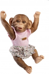 Podaruj swojej małpce – niemowlęciu Reborn nowy urok dzięki temu delikatnemu ubranku w rozmiarze 32 cm. Różowy top z ozdobnymi falbankami i kwieciste majteczki świetnie do siebie pasują i łatwo się zakładają. Praktyczny smoczek z pętelką urealnia zabawę i opiekę nad „niemowlęciem”.