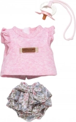 Różowy top z falbankami, kwieciste bloomersy i smoczek tworzą doskonale dopasowany zestaw do codziennej zabawy i przebierania.