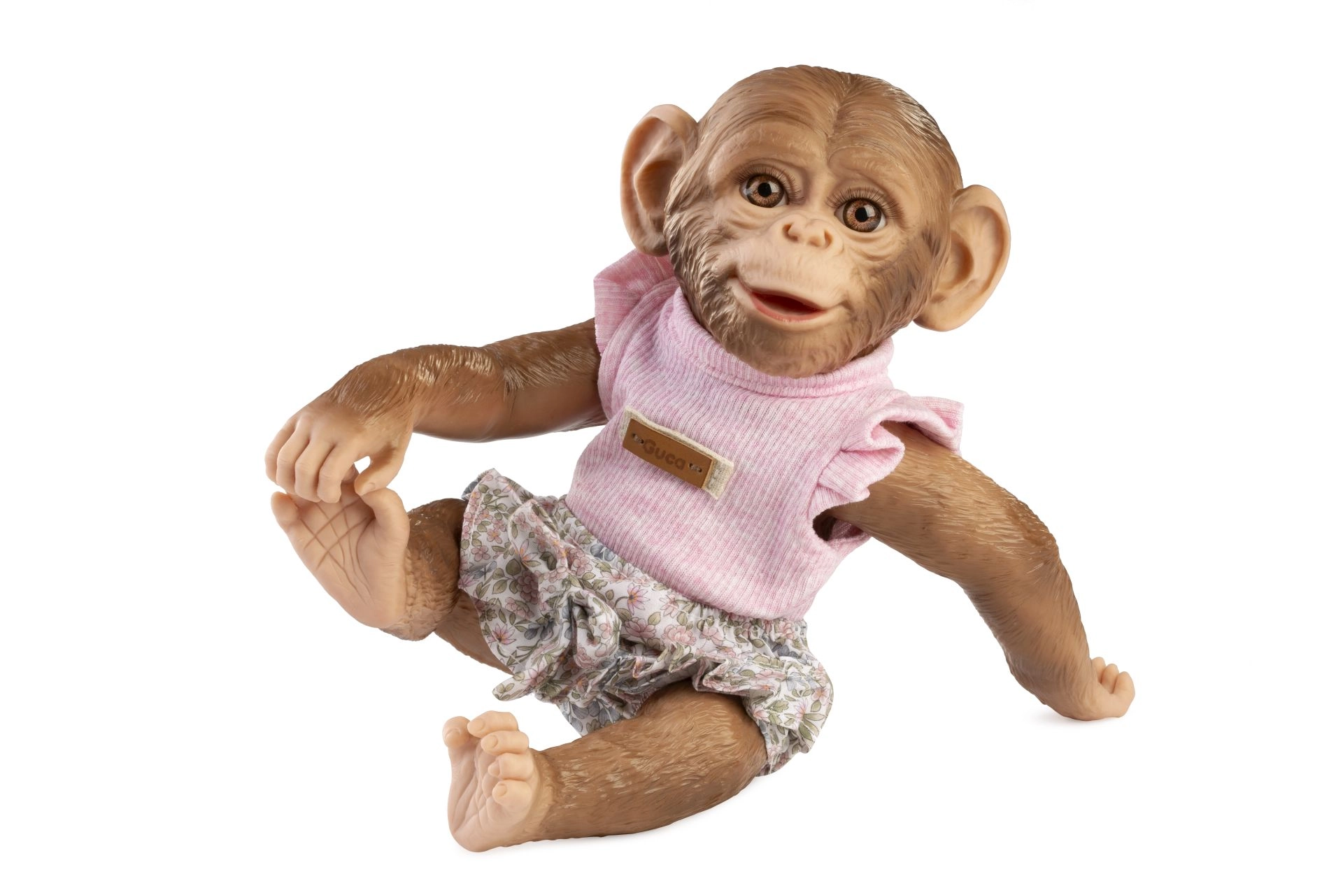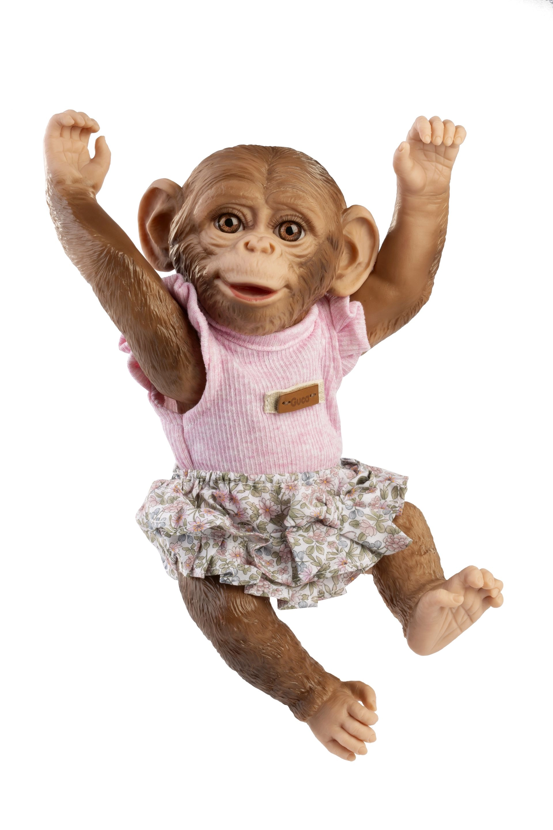 Uroczy 3‑częściowy zestaw ubranek dla małpki – niemowlęcia Reborn w rozmiarze 32 cm zawiera różowy top, kwieciste majteczki/bloomersy oraz smoczek z tekstylną pętelką. Zestaw jest ręcznie wykonany w Hiszpanii, przyjemny w dotyku i idealny do pomysłowej zabawy i przebierania. Odpowiedni dla dzieci od 3 lat.