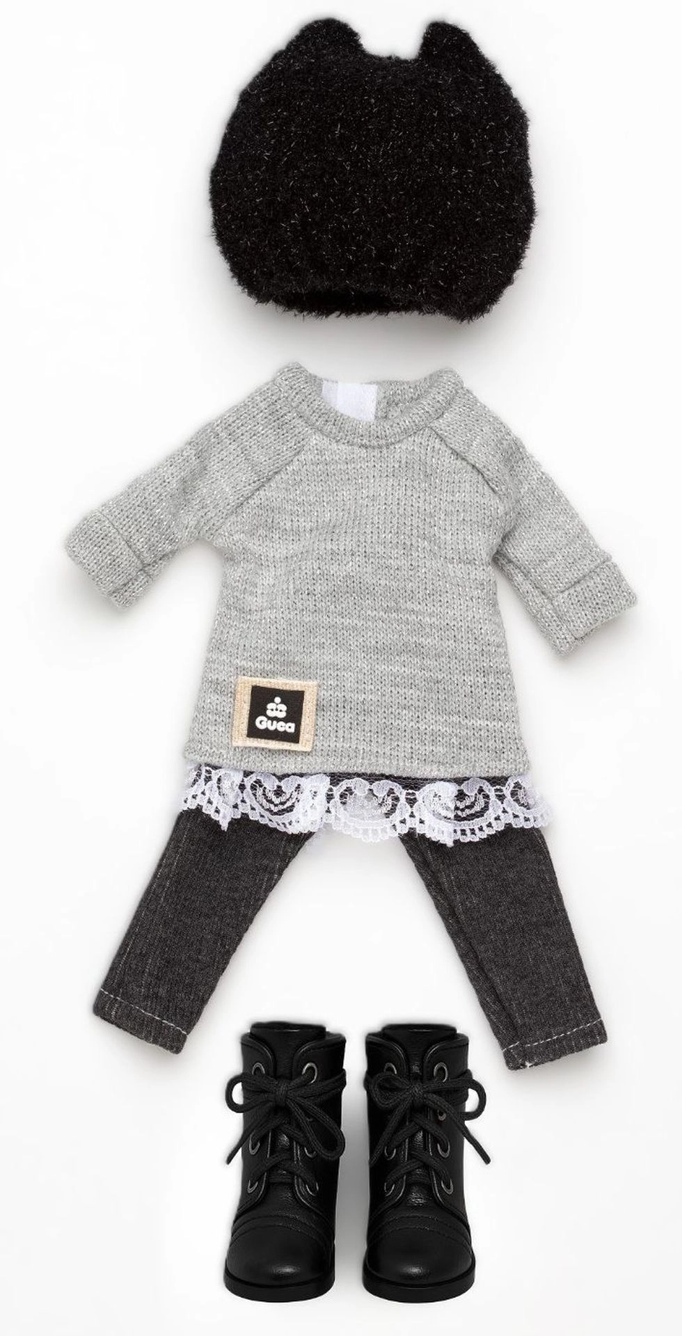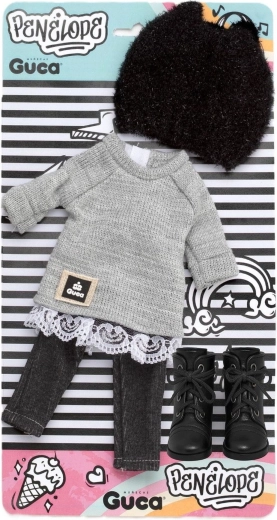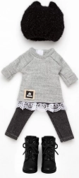 Trzy dopasowane elementy odzieży uzupełnione bucikami tworzą gotowy look dla lalki PENELOPE w rozmiarze 34 cm.