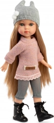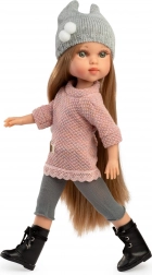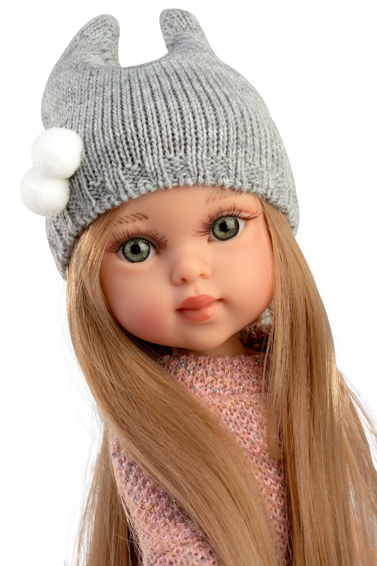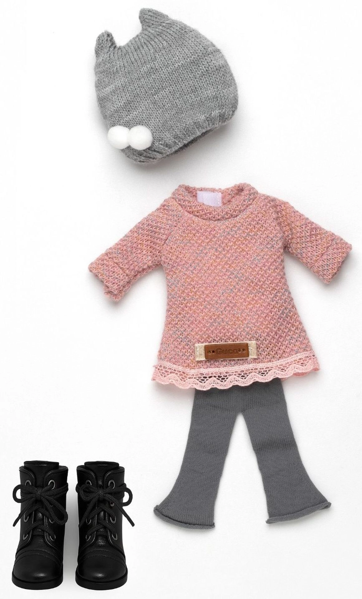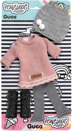 Podaruj swojej lalce Penelope o wysokości 34 cm nową garderobę. Ten ręcznie wytwarzany zestaw łączy delikatny dzianinowy wygląd i komfort: różowa tunika ze zdobieniem, szare dzwoniaste legginsy, szara czapka z dwoma pomponami oraz czarne sznurowane buciki. Ubranko świetnie leży i dzięki przemyślanym detalom wspiera kreatywną zabawę i stylizację.