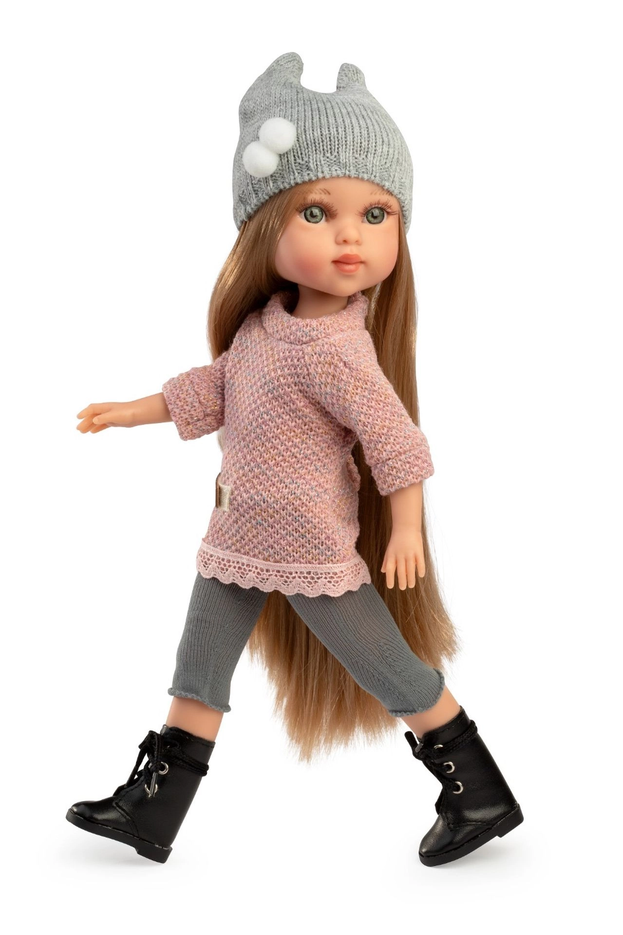 Zestaw zawiera tunikę, legginsy, czapkę z pomponami oraz czarne sznurowane buciki – wszystko skomponowane w nowoczesnym stylu dla lalek 34 cm.