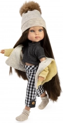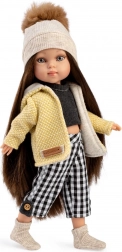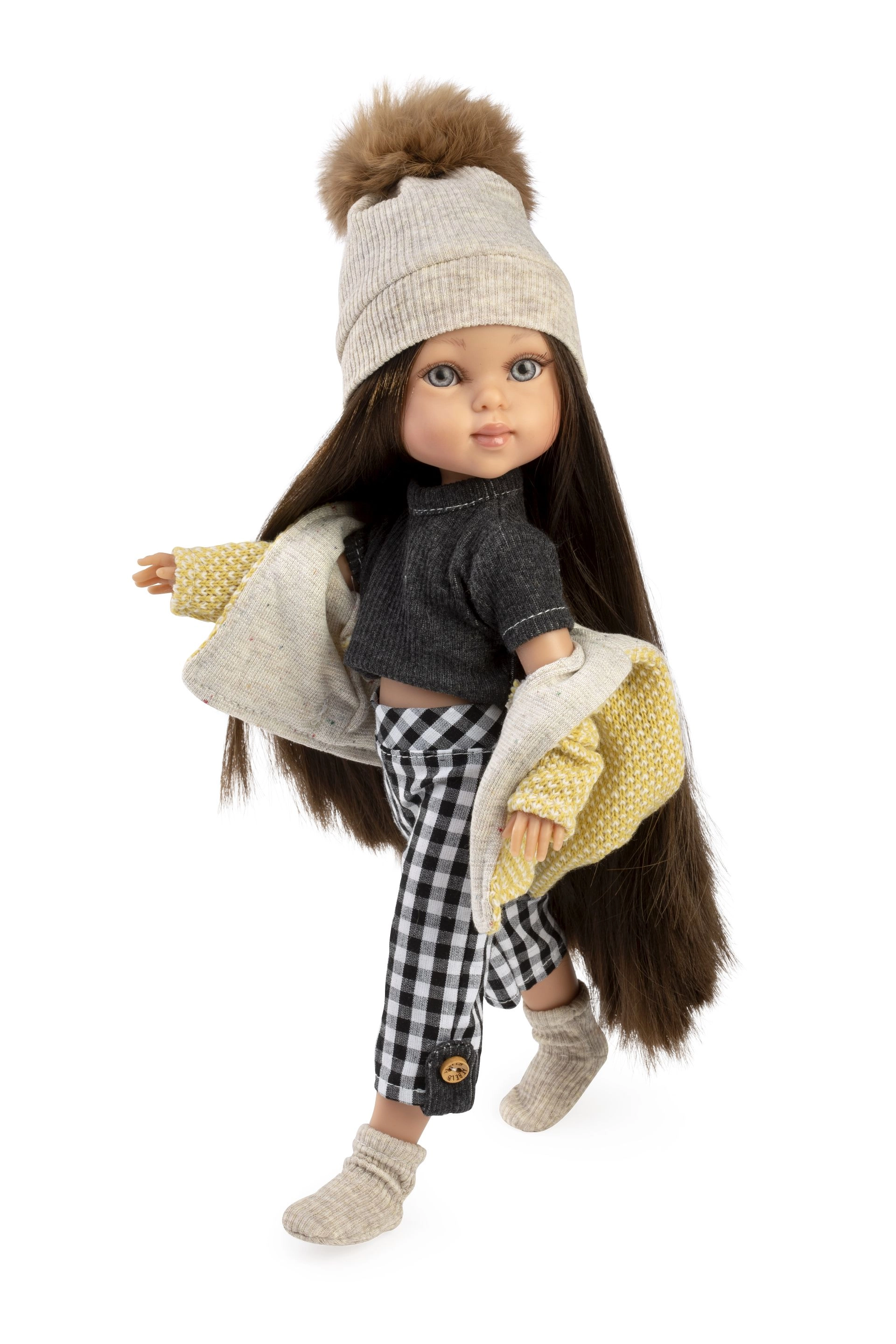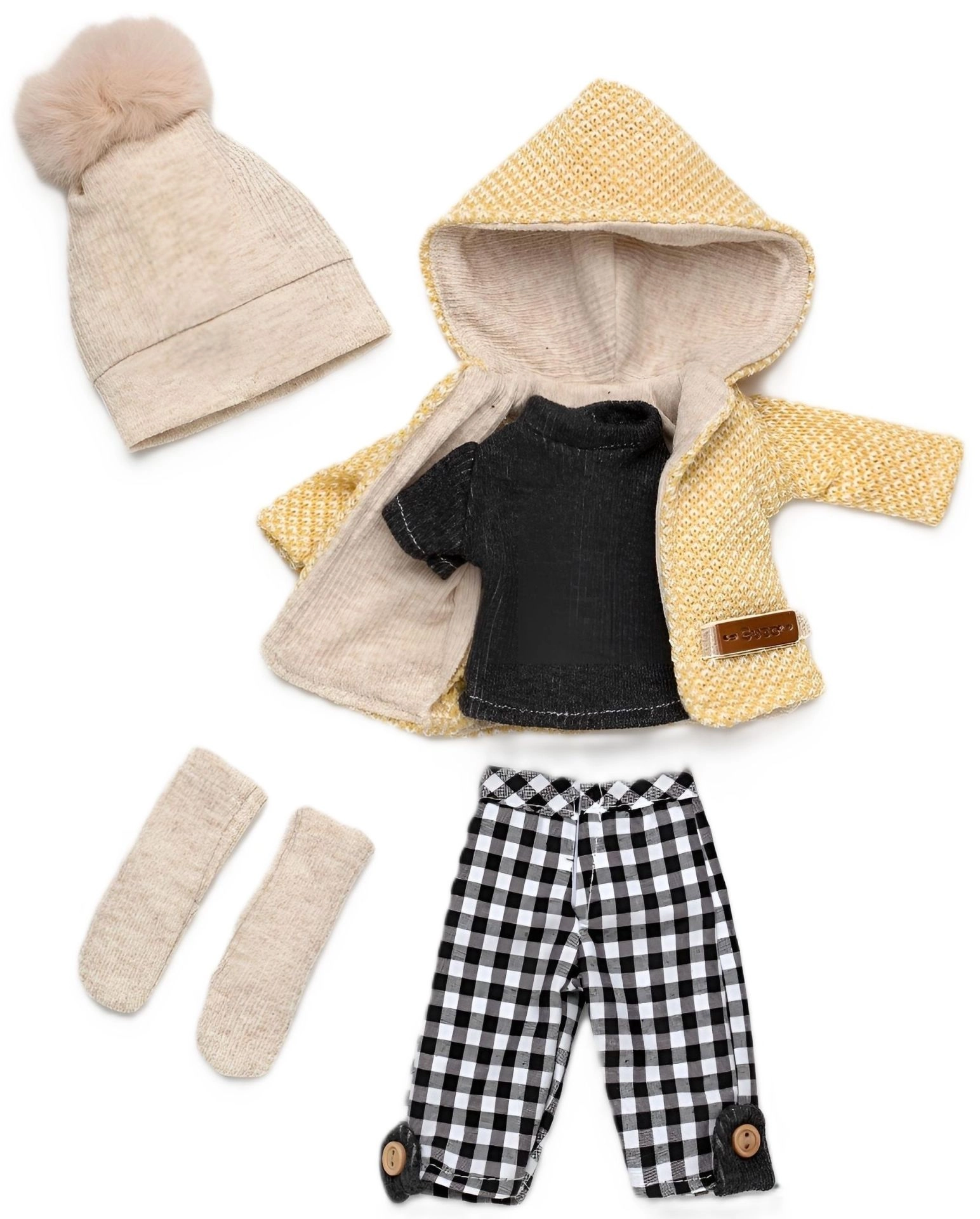 Wzbogacisz garderobę swojej lalki Penelope o starannie dobraną, 5‑częściową kolekcję łączącą nowoczesny wzór kraty z przytulnymi dzianinami. Zestaw obejmuje żółtą kurtkę z kapturem z miękką podszewką, dzianinową czapkę z pomponem, czarną koszulkę, spodnie w kratę z guzikowymi detalami oraz dzianinowe skarpetki/ocieplacze. Wszystko zaprojektowane tak, aby łatwo się ubierało i zdejmowało.