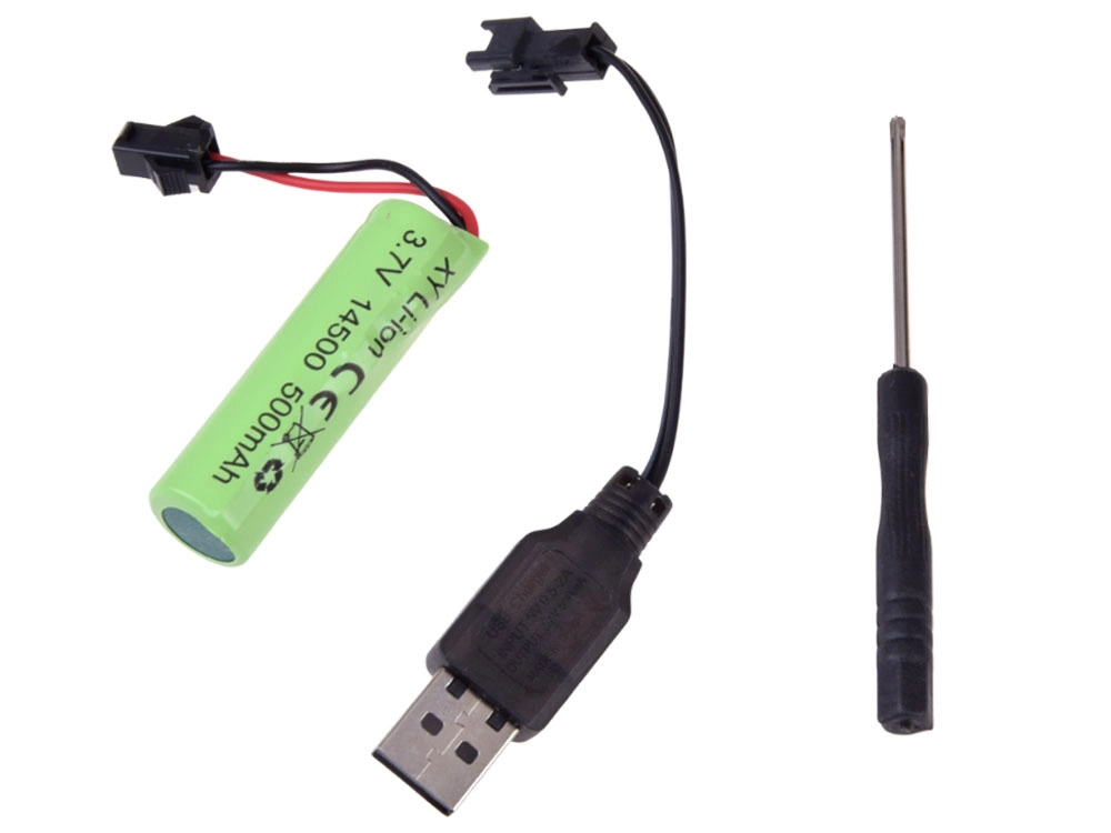W zestawie znajduje się akumulator Li‑ion 14500 3,7 V oraz kabel USB do wygodnego ładowania. Pierwsze ładowanie trwa około 1 godzinę.