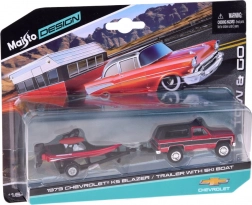 Ten licencjonowany zestaw od Maisto łączy klasyczny CHEVROLET K5 BLAZER 1979 w czerwono-czarnym wydaniu z przyczepą i elegancką motorówką. Metalowe nadwozie, precyzyjne proporcje oraz autentyczne detale karoserii i wnętrza ucieszą każdego fana amerykańskiej klasyki.