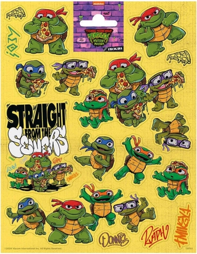 Odkryj zabawne naklejki Wojownicze Żółwie Ninja w większym formacie o wymiarach 15,6 × 20 cm. Idealne do ozdabiania zeszytów, pamiętników i prezentów. Odpowiednie dla dzieci od 3 lat.