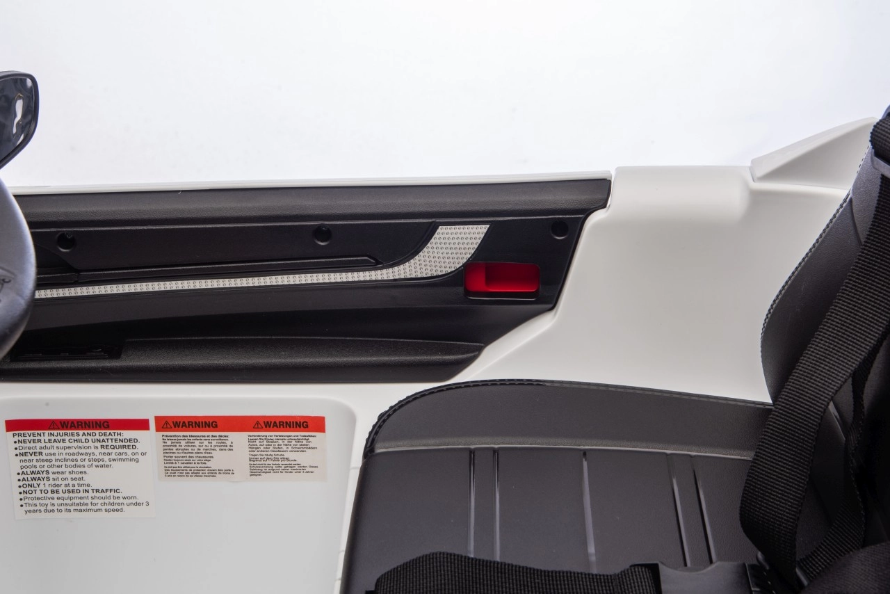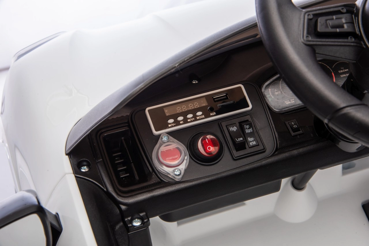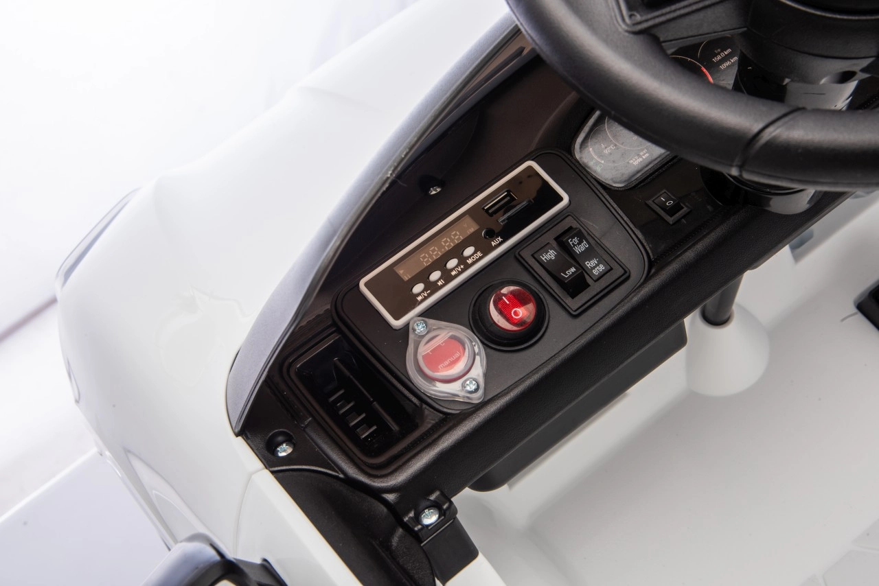 Dla maksymalnego bezpieczeństwa rodziców i dzieci nie zabrakło pilota 2,4 GHz z trzema prędkościami i awaryjnym przyciskiem Stop. Wnętrze zachwyca czarnym siedziskiem z ekoskóry z pasem, funkcjonalnym panelem z MP3/Bluetooth/FM oraz przyciskami klaksonu i dźwięków na kierownicy. Otwierane drzwi, światła LED i wysokiej jakości wykonanie podkreślają atrakcyjny wygląd i codzienną frajdę z jazdy.