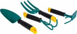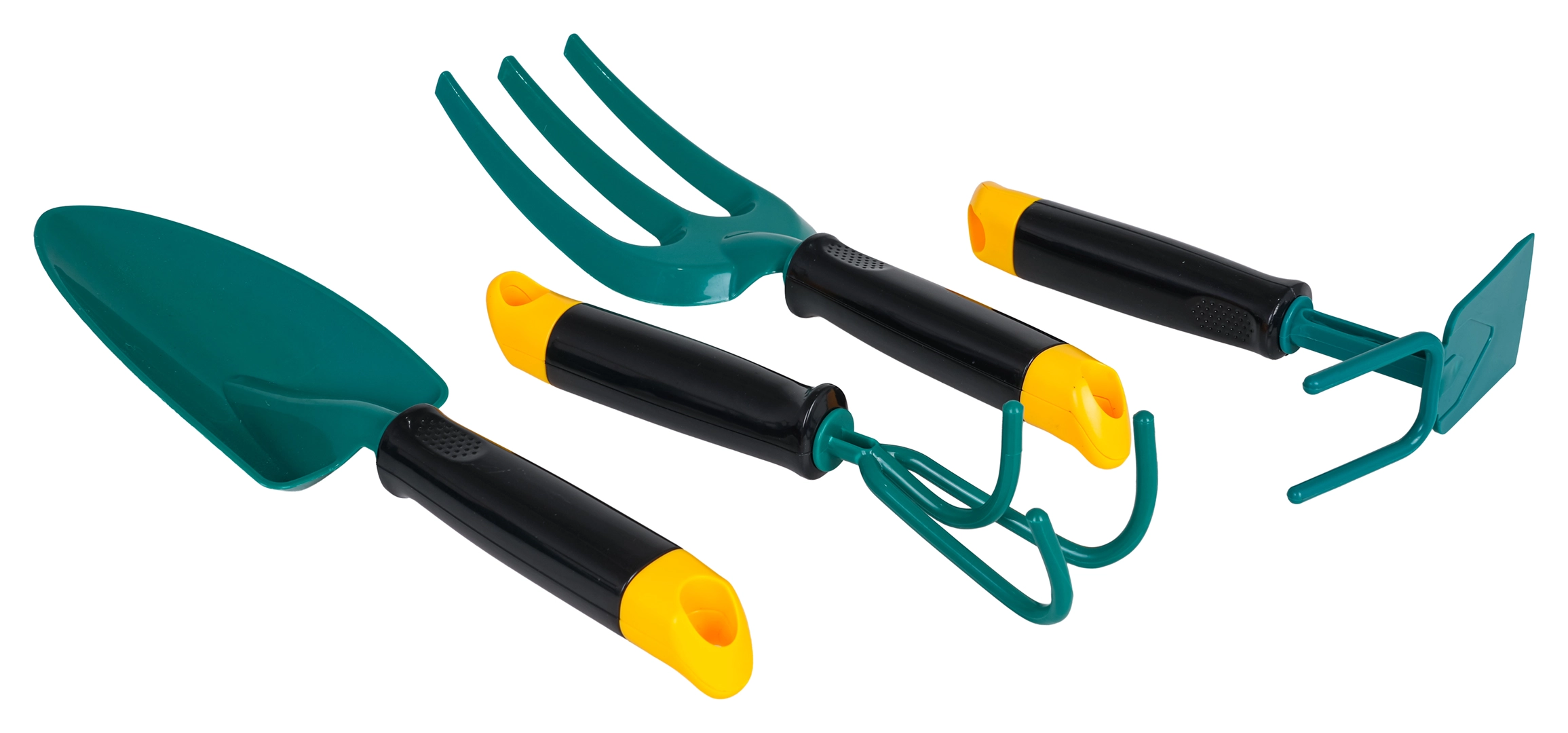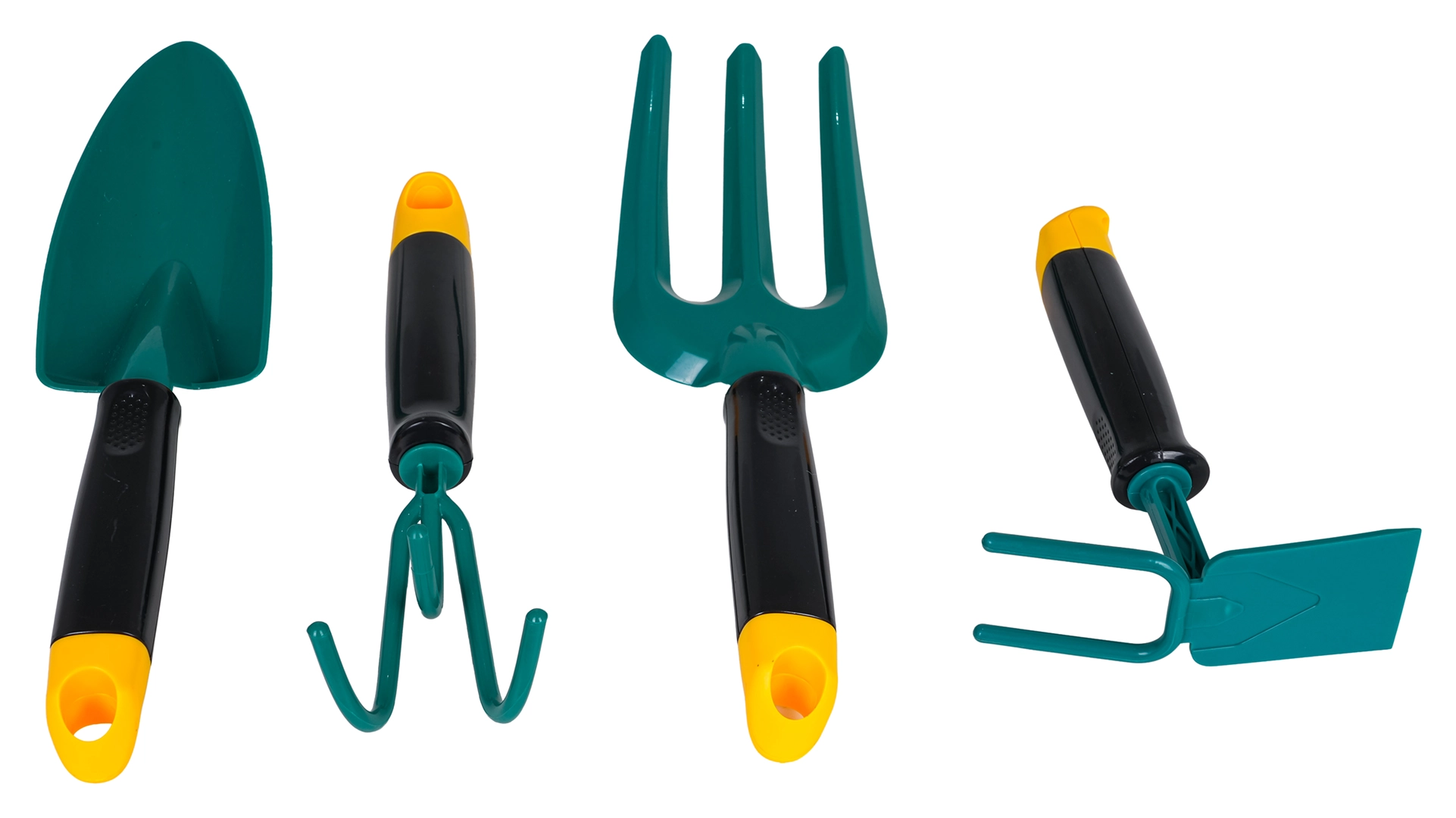 Łopatka, grabki, kultywator i motyczka mają ergonomiczne, antypoślizgowe rękojeści oraz gładkie krawędzie dla bezpiecznego użytkowania przez małe dłonie.