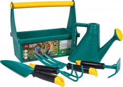 W zestawie znajdziesz łopatkę, grabki, widełki/kultywator, kielnię (szpachelkę) oraz konewkę z zdejmowaną końcówką zraszającą. Wszystko wykonane z wysokiej jakości, gładkiego plastiku, przyjemnego w dotyku i łatwego w czyszczeniu. Idealne do zabawy w ogrodzie, na balkonie i w piasku.