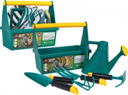 przenośne pudełko/koszyk, łopatka, grabki, widełki/kultywator, motyczka/kielnia, konewka z końcówką zraszającą