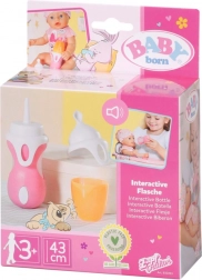 Interaktywna butelka i łyżeczka dla lalek BABY Born to doskonały dodatek do realistycznej zabawy. Zestaw zawiera butelkę z dwoma nasadkami – jedną do picia z efektem dźwiękowym i drugą z łyżeczką do karmienia kaszki. Wystarczy wycisnąć kaszkę przez otwór na dole i butelka jest gotowa do użycia.