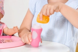 Ciesz się elastycznością dzięki dwóm nasadkom: jednej do picia i drugiej z łyżeczką do karmienia, co czyni tę zabawkę uniwersalnym dodatkiem do każdej zabawy z lalkami.