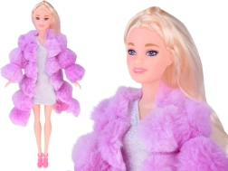 Lalka z długimi blond włosami, błyszczącą sukienką i mięciutkim różowym/fioletowym futerkiem doda zabawie elegancji i kreatywności.
