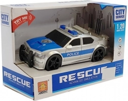 Srebrny policyjny samochód w skali 1:20 ucieszy małych miłośników akcji. Dzięki efektom świetlnym i dźwiękowym, trzem przyciskom na dachu oraz napędowi ciernemu dzieci przeżyją realistyczną zabawę w akcję. W zestawie znajdują się baterie, jest też otwierany tylny bagażnik i certyfikat bezpieczeństwa CE.