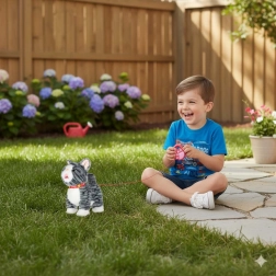 Interaktywne kociątko dzięki sterowaniu na smyczy łatwo prowadzić, a po naciśnięciu przycisku rusza do przodu w takt wesołych melodii. Na głaskanie reaguje miauczeniem oraz ruchami ogonka i języczka, co sprawia naturalne wrażenie i pomaga dzieciom szybko nawiązać więź.