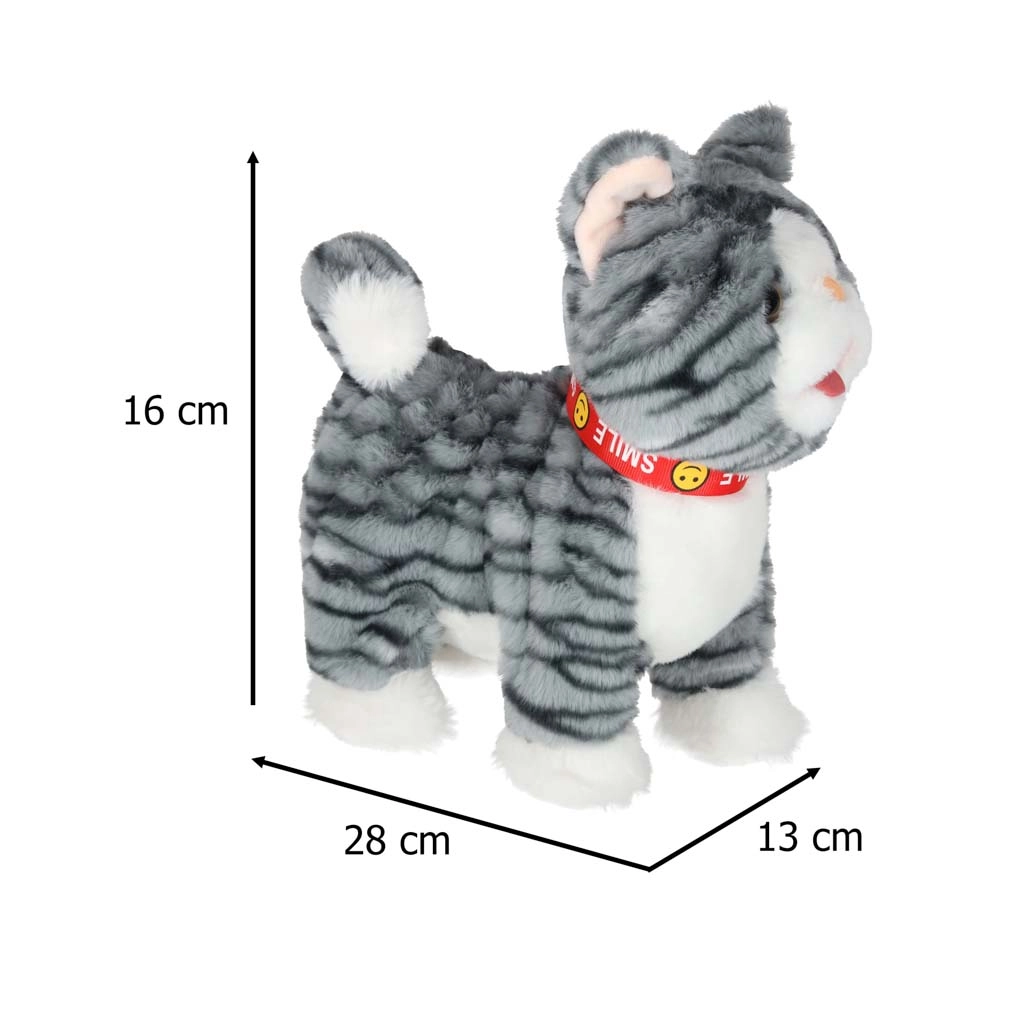 Urocza interaktywna pluszowa kotka na smyczy zapewni dzieciom godziny zabawy. Po naciśnięciu przycisku rusza do przodu, miauczy, merda ogonem i porusza języczkiem. Mięciutkie szare prążkowane futerko zachęca do przytulania, a zabawa jednocześnie uczy opiekowania się zwierzątkiem. Idealny prezent dla dzieci od 3 lat.
