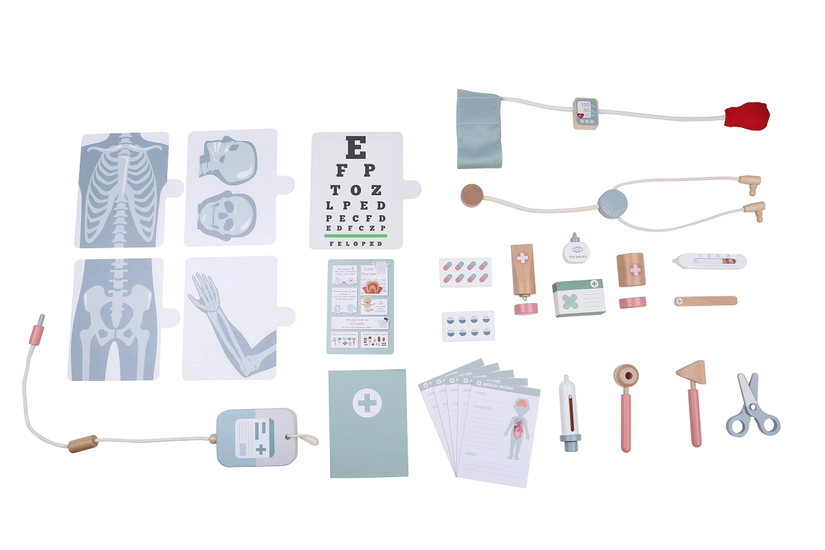 - 30-elementowe wyposażenie – stetoskop, ciśnieniomierz, termometr, otoskop, strzykawka, młoteczek, pęseta, nożyczki, kroplówka, buteleczki i 4 zdjęcia RTG.