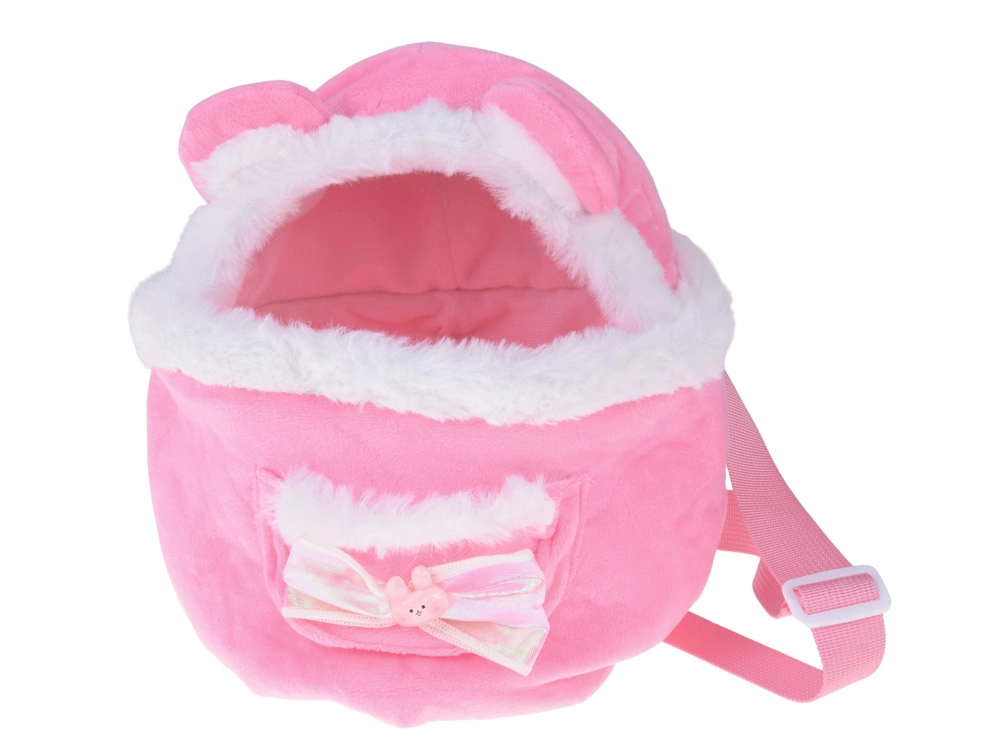 Uroczy plecaczek z uszkami, miękką lamówką i kieszonką. Regulowane szelki zapewniają wygodne noszenie oraz miejsce na butelkę i akcesoria.