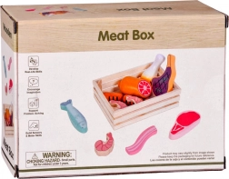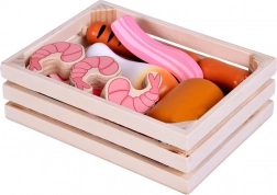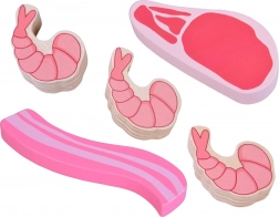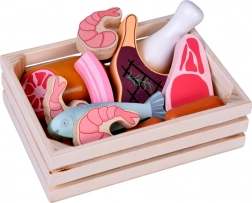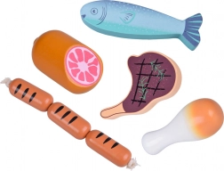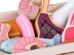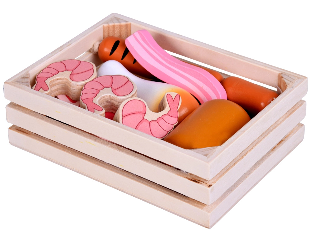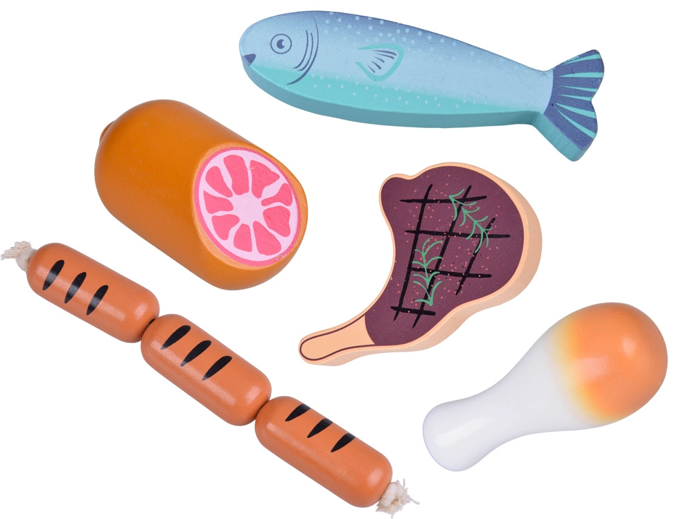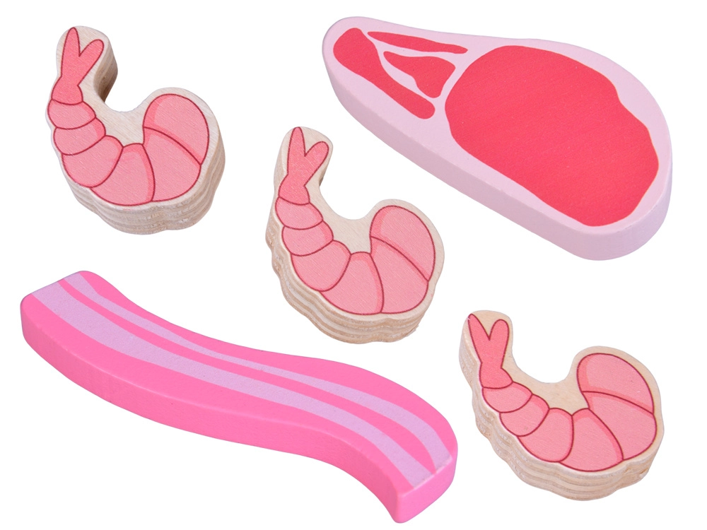 Ten drewniany zestaw produktów zawiera wszystko, co dzieci znają z kuchni lub sklepu: parówki, salami, bekon, steki, kawałki kurczaka, rybę i krewetki. Elementy są solidne, przyjemnie zaokrąglone i szczegółowo malowane, aby wyglądały realistycznie, a jednocześnie pozostawały całkowicie bezpieczne do zabawy.