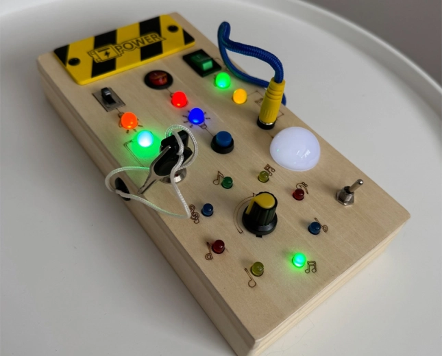 - Drewniana montessori tablica manipulacyjna/aktywności z efektami świetlnymi LED