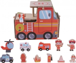 Zabawka wykonana jest z wysokiej jakości drewna oraz metalowych elementów dla większej trwałości. Zawiera 13 kolorowych części, w tym figurki strażaków, pojazdy, akcesoria i sprzęt ratunkowy. Doskonała dla dzieci od 3 lat, wspiera małą motorykę, koordynację ręka–oko oraz naukę współpracy zespołowej.
