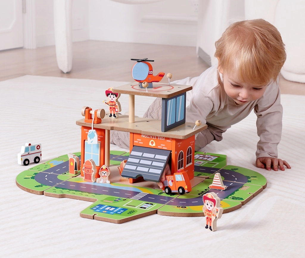 Ta drewniana strażnica pożarna oferuje dzieciom bogaty świat ratowniczych przygód. Dzięki sprytnemu rozwiązaniu 2 w 1 łatwo składa się do kompaktowego wozu strażackiego, więc dzieci mogą zabrać ją wszędzie. Stacja ma bramę wyjazdową, drogę i strefy do zabawy dla pojazdów i figurek – idealne do swobodnej zabawy i rozwijania wyobraźni.
