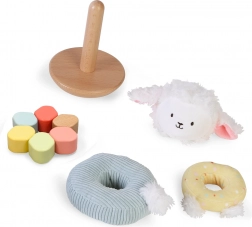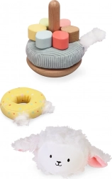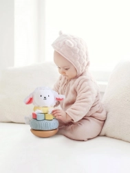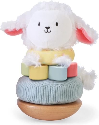 Ta układanka do sztaplowania łączy gładkie drewniane elementy z miękkimi materiałowymi krążkami i przytulną pluszową główką owieczki. Dzieci stopniowo nakładają krążki o różnych rozmiarach i fakturach na patyczek, dzięki czemu ćwiczą precyzję, cierpliwość i logiczne myślenie. Powstaje ciepły i bezpieczny towarzysz codziennej zabawy.