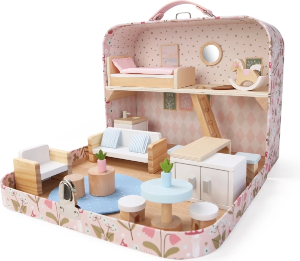Odkryj magiczny świat w podróży: przenośny domek dla lalek ukryty w eleganckiej walizce. Po otwarciu zamienia się w przytulne mieszkanie z miniaturowymi meblami i dekoracjami. Idealny do zabawy w domu i w drodze, wspiera dziecięcą kreatywność i wyobraźnię. Zawiera konika na biegunach, łóżeczko, sofę, fotel, drabinkę na piętro i inne akcesoria. Przenośna walizka, bogate wyposażenie, łatwe przenoszenie i zabawa dla dzieci od 3 lat.