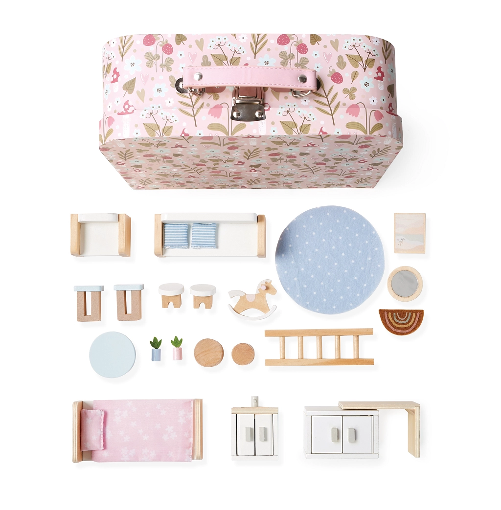 Ten stylowy domek dla lalek w praktycznej walizce oferuje wszystko, czego małe lalki potrzebują do wygodnego życia. Po otwarciu tworzysz kompletną przestrzeń dzienną z przemyślanymi detalami, które zachwycą dzieci i wciągną je do zabawy. Dzięki kompaktowym wymiarom łatwo zabierzesz go na wycieczkę, do dziadków lub na wakacje.