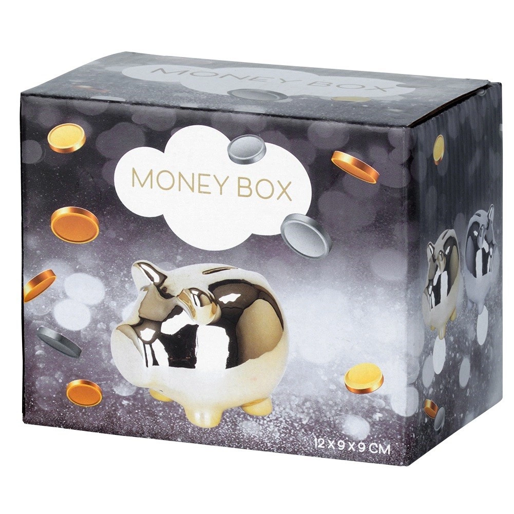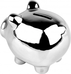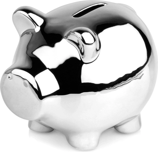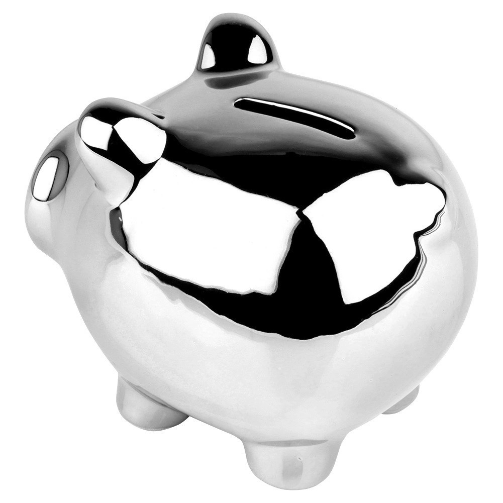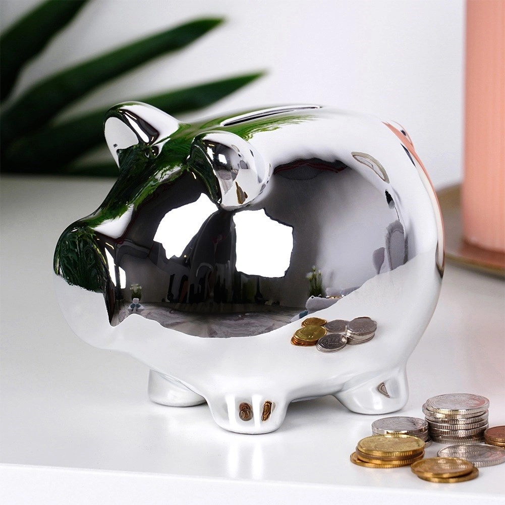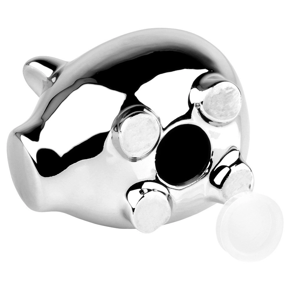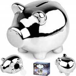 Elegancka skarbonka w kształcie świnki z lustrzanym srebrnym wykończeniem z ceramiki. Praktyczny dolny otwierany korek pozwala wybierać oszczędności bez rozbijania. Kompaktowe wymiary 11,5 × 9 × 9 cm i nowoczesny wygląd czynią ze skarbonki stylowy dodatek dekoracyjny oraz świetny prezent dla dzieci i dorosłych.