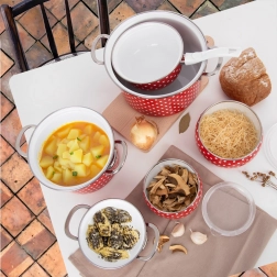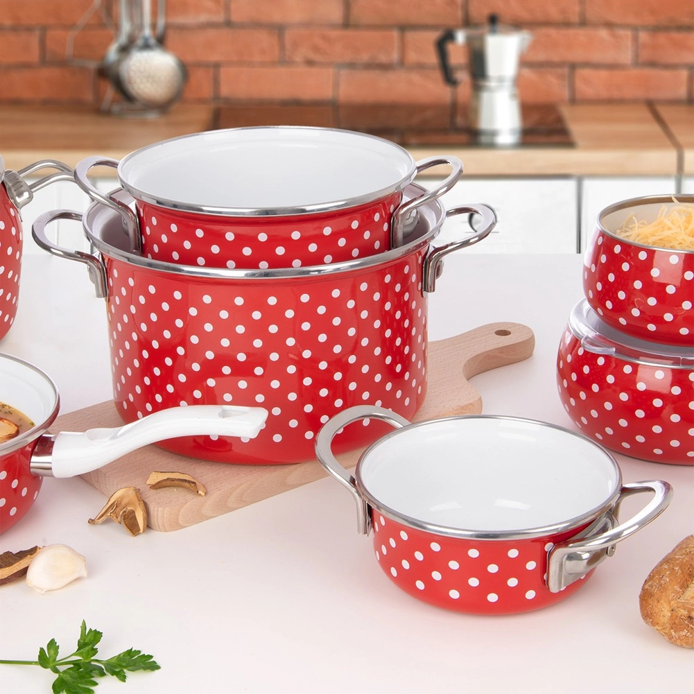 Popularny emaliowany garnek w czerwonym kolorze z białymi kropkami wprowadzi do kuchni urok retro i jednocześnie zaoferuje praktyczne właściwości do codziennego gotowania. Mocny korpus ze stali emaliowanej zapewnia równomierne rozprowadzanie ciepła i długą żywotność, a nierdzewny rant i robustne boczne uchwyty dbają o bezpieczną obsługę.